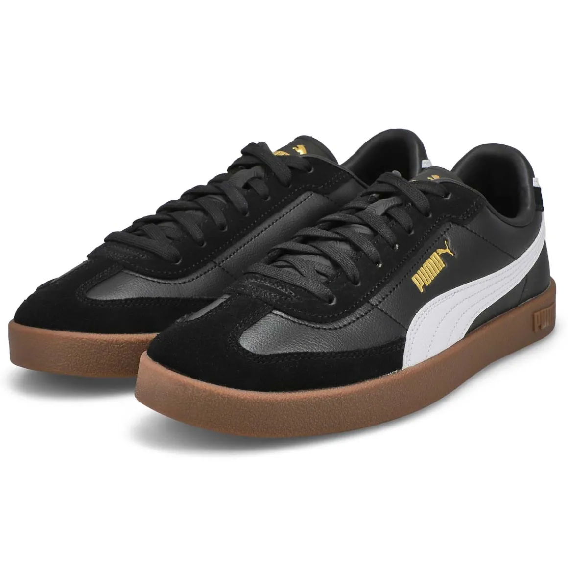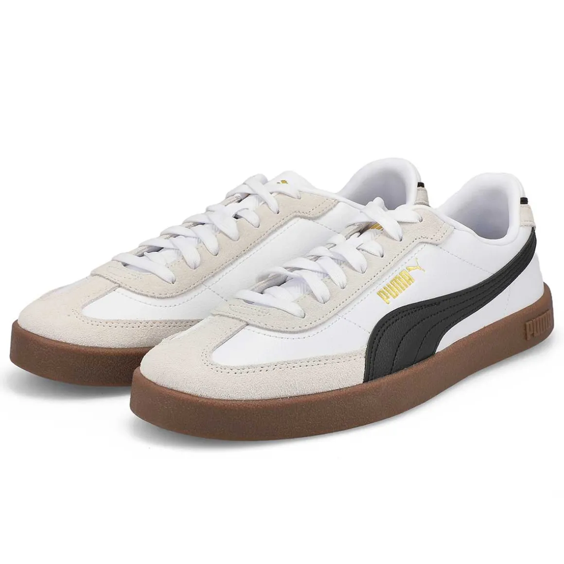 Baseketball-inspired, with clean, court-ready lines and a sporty silhouette, the Club Era II black/ white/ gold lace up sneaker from Puma makes classic look cool. Featuring comfortable construction, branding and elements for added flair. The upper of this shoe is made with at least 20% recycled materials as a step toward a better future.
