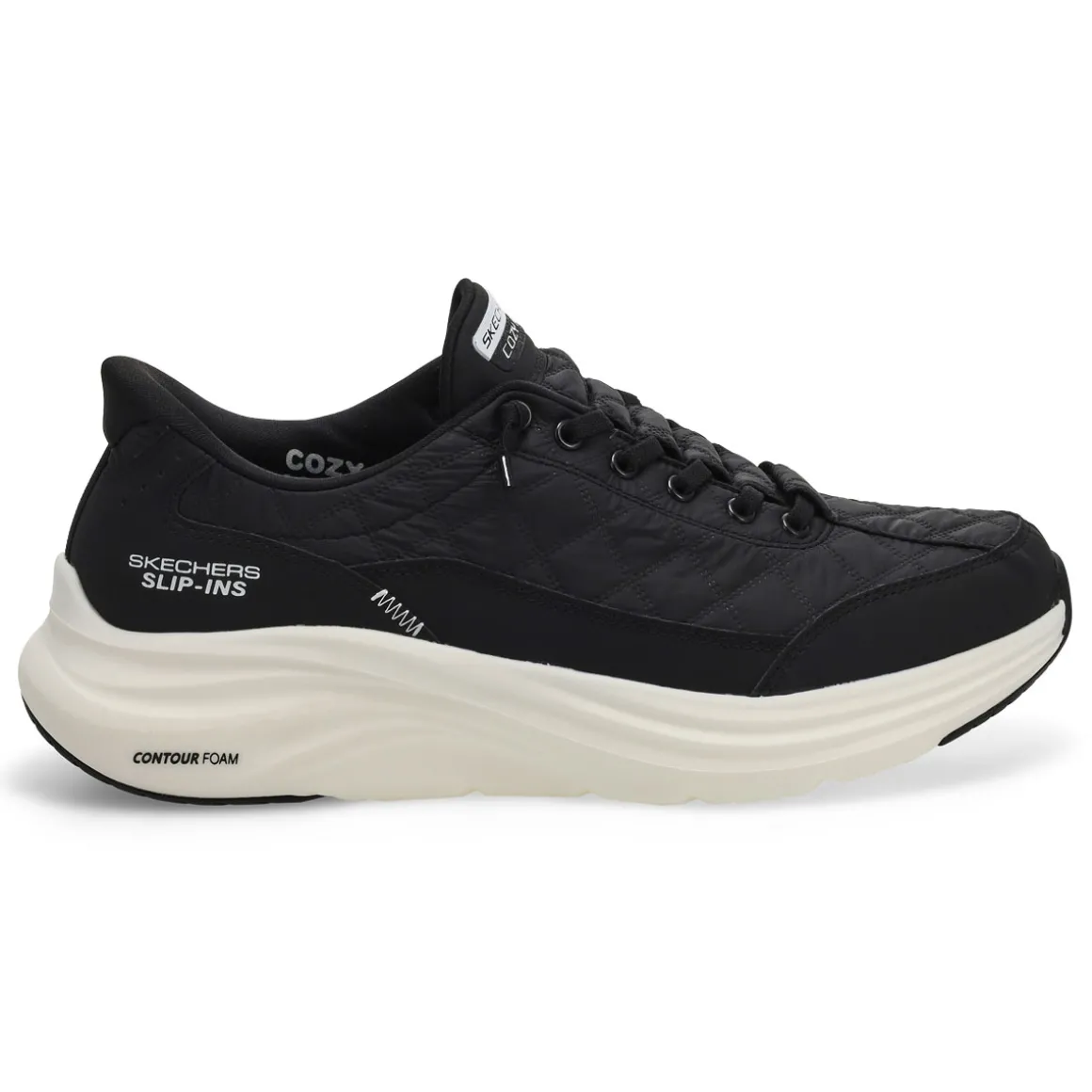Surround your feet in effortless comfort wearing the Hands Free Slip-ins Contour Foam Cozy Fit Sneaker from Skechers.. Designed with our Heel Pillow, this slip-on style features a quilted Cozy Fit and synthetic overlay upper with tied-off stretch laces, Contour Foam midsole cushioning, and Skechers signature cushioned Skechers Air-Cooled Memory Foam insole.