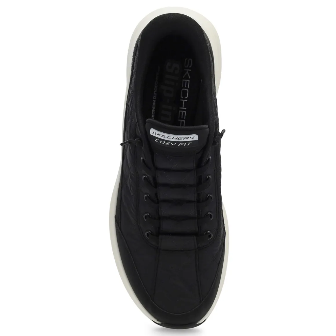 Surround your feet in effortless comfort wearing the Hands Free Slip-ins Contour Foam Cozy Fit Sneaker from Skechers.. Designed with our Heel Pillow, this slip-on style features a quilted Cozy Fit and synthetic overlay upper with tied-off stretch laces, Contour Foam midsole cushioning, and Skechers signature cushioned Skechers Air-Cooled Memory Foam insole.