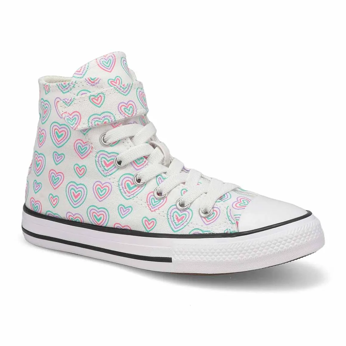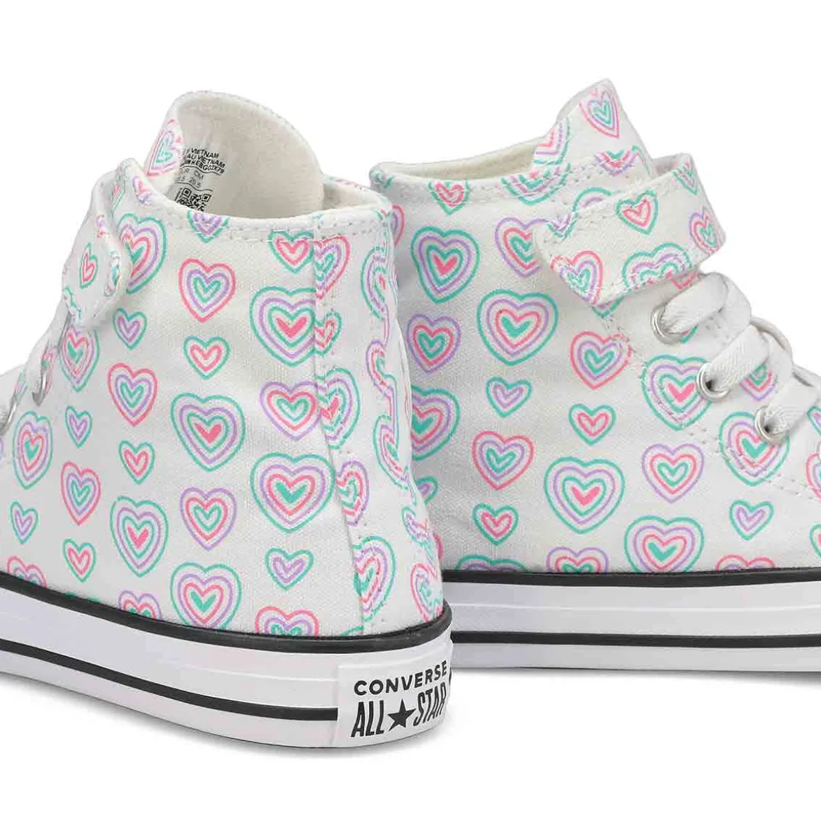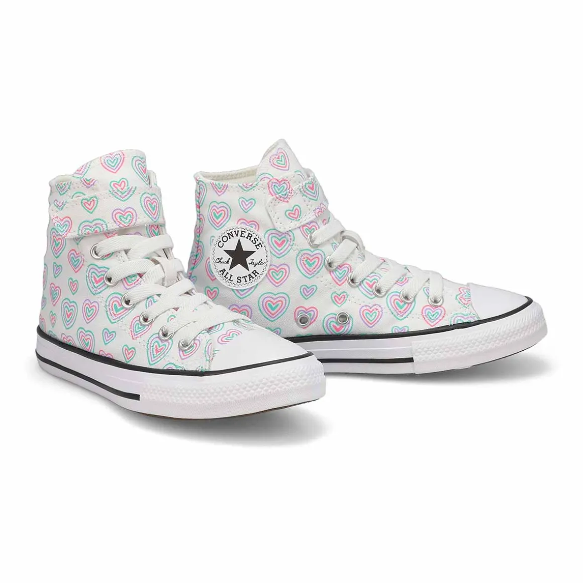 Let your kid’s summer style shine with classic Chuck Taylor All Star 1V Happy Hearts sneaker from Converse. The iconic high top gets redesigned for kids, with a cushioned SmartFOAM sockliner, softened stitches and linings, and one hook-and-loop strap for easy on and off. The All Star 1V look gets complemented by Chuck Taylor All Star classics, like a star ankle patch, contrast stripes, and diamond pattern outsole.