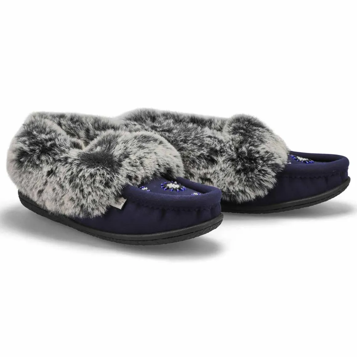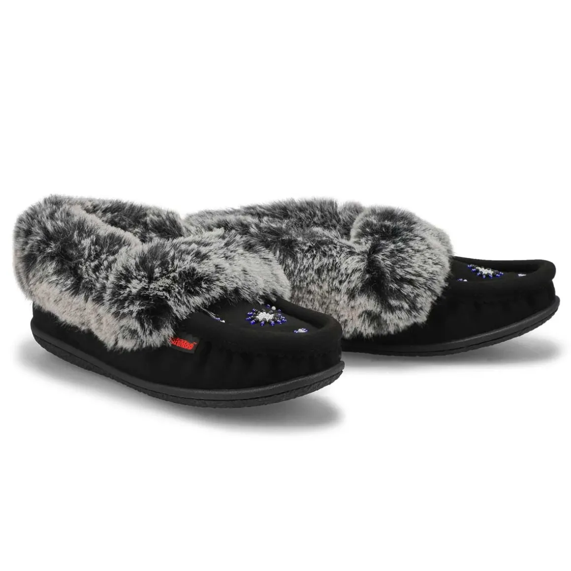The SoftMoc CUTE 5 V3 black/ grey faux rabbit fur SoftMocs features faux suede upper collared with faux rabbit fur. The Cute 5 V3 is designed with a new and improved combination latex and memory foam insole, giving you superior rebound comfort. New upgraded soft, plush lining surrounds the foot in comfort. The TPR outsole is great for durability. Slight dye transfer may occur during the first few wearings. Style is not made for snow or ice conditions.