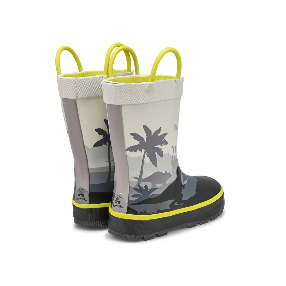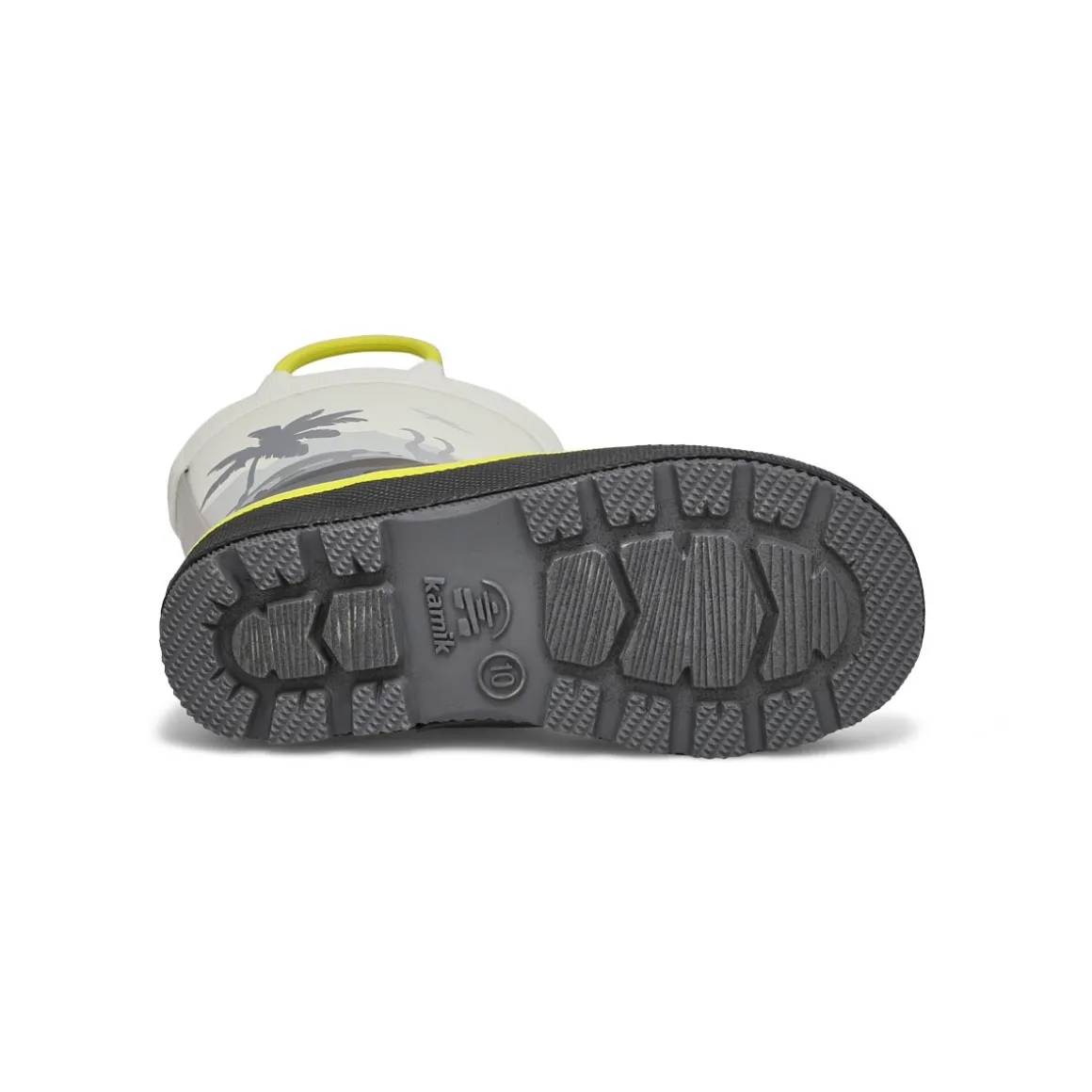 Your little one will feel super brave in the Dino waterproof grey rain boots from Kamik. These 100% waterproof kids’ rain boots are made of flexible, vulcanized rubber that’s PVC-free. Perfect for walking around and exploring on rainy days. Featuring NiteRays reflective technology. Removable EVA footbed for cushioning and comfort.