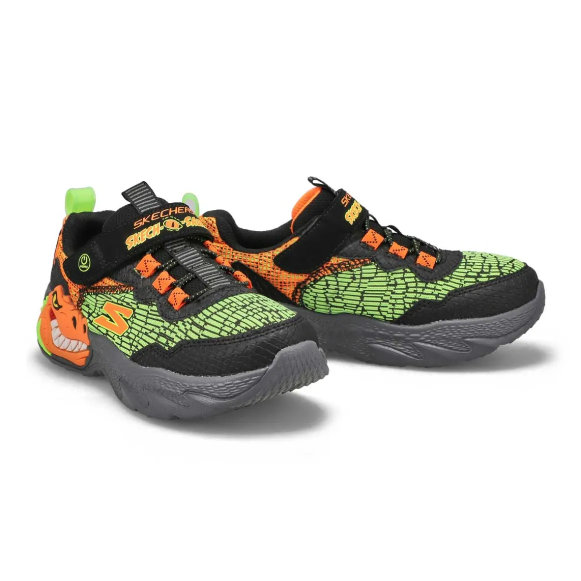 Stomp in roar-some fun and comfort wearing the Dino-Lights black/ orange sneaker from Skechers. This light-up dinosaur theme design features a reptilian style mesh and synthetic upper with a stretch-lace front, hook-and-loop instep strap and a T-Rex heeled midsole. The Dino Lights sneaker is designed with a shock-absorbing t-rex midsole.