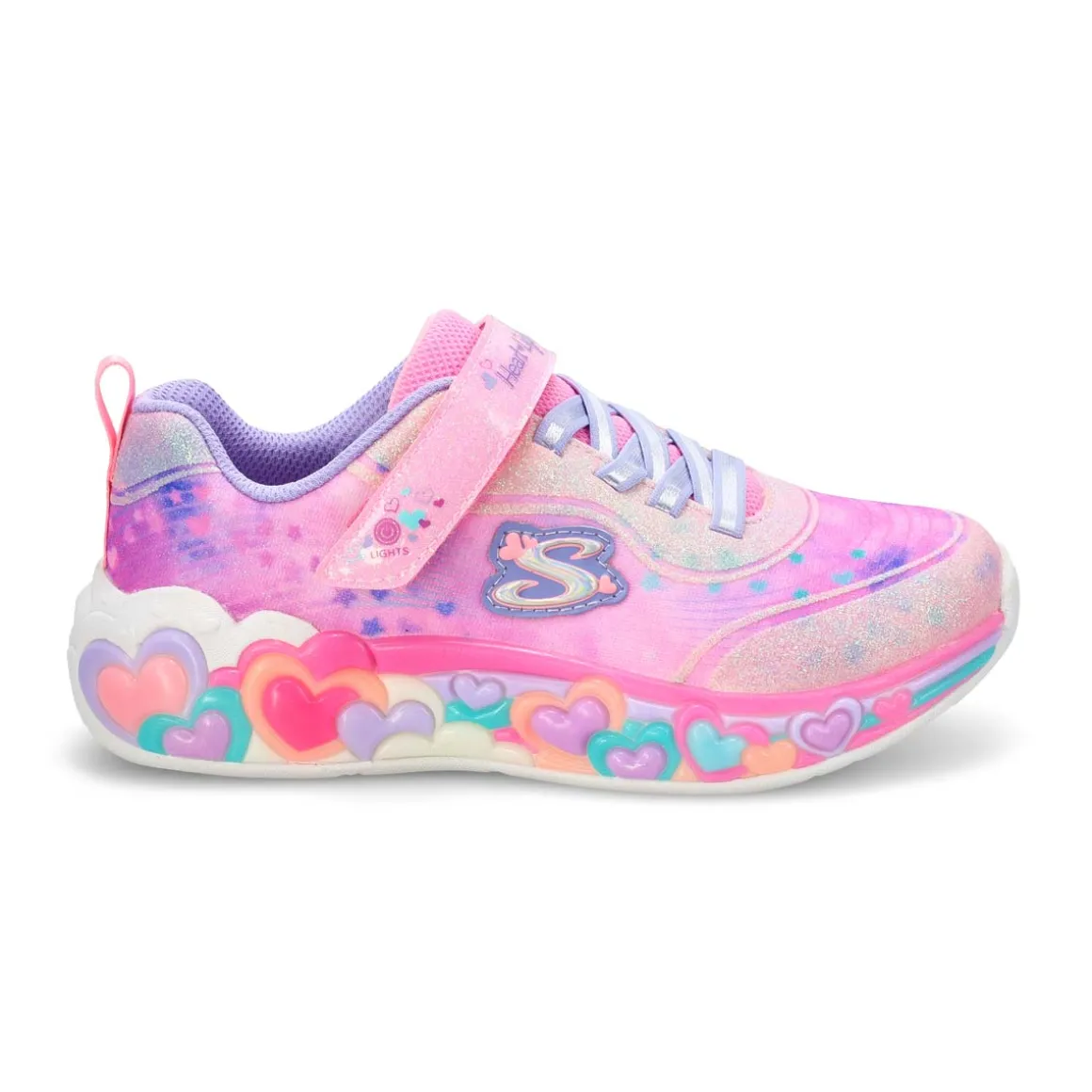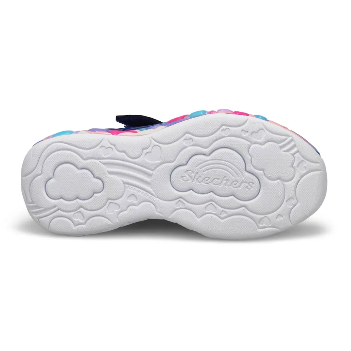 Sporty style gets lit-up and lovable with S-Lights: Eternal Heart Lights navy/ multi sneakers from Skechers. This lighted design features a sparkle mesh and synthetic glitter upper with stretch-laced front, and a Skechers adaptive closure. Designed with a cushioned comfort insole. Cushioned light-up heart design midsol, featuring an On/off light button.