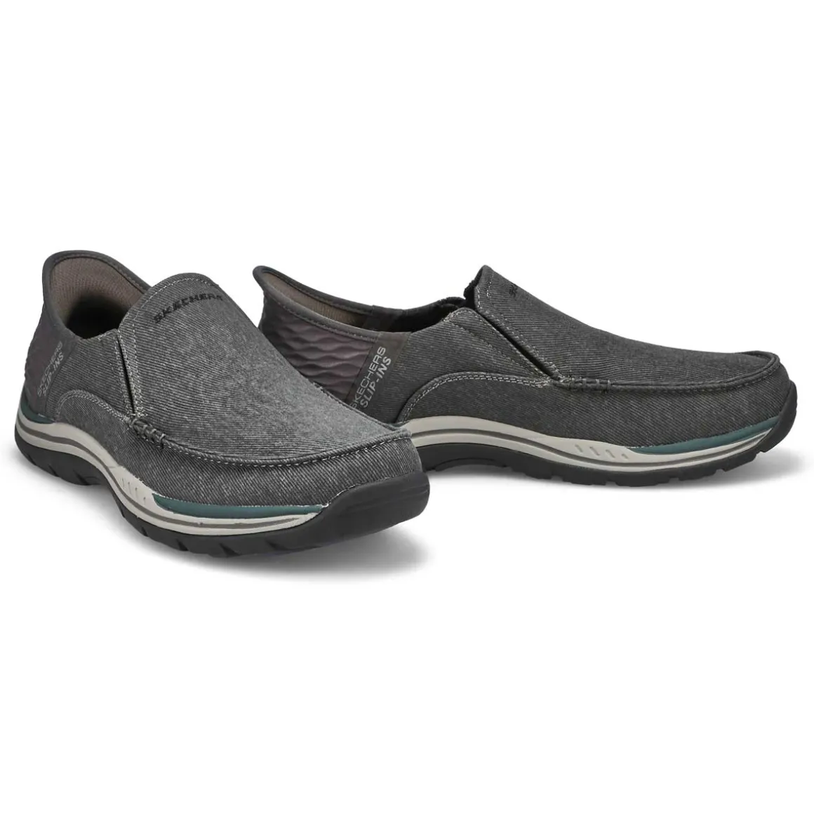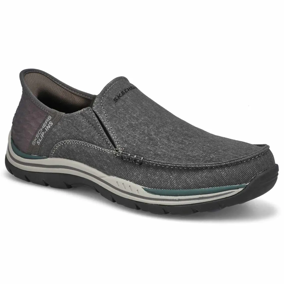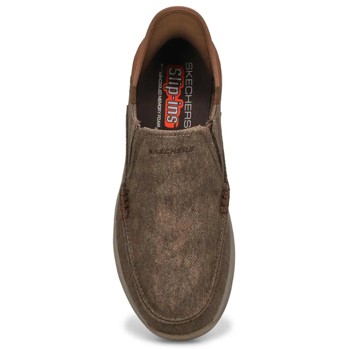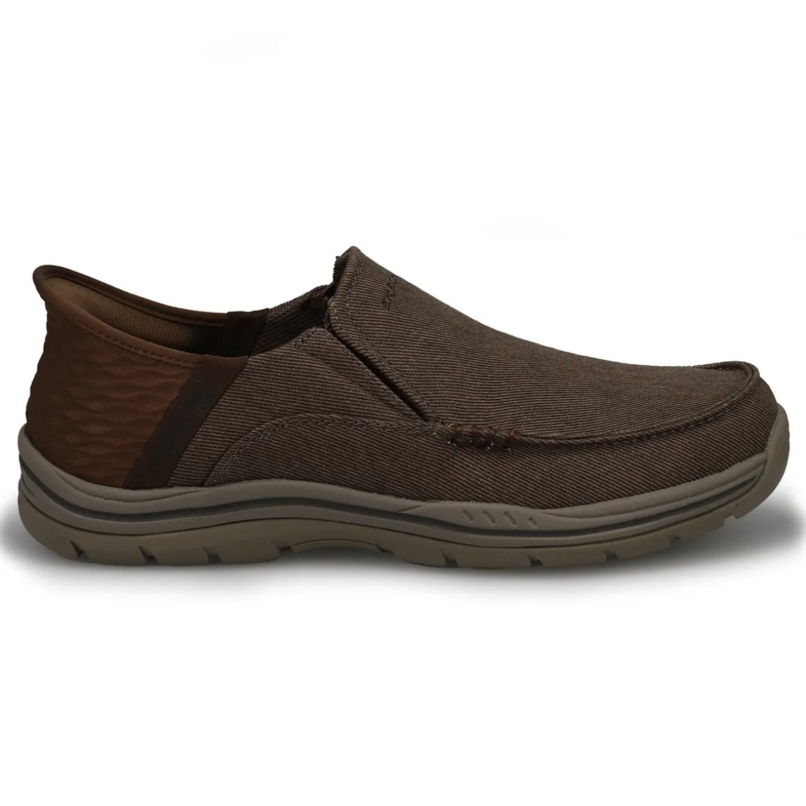 Find your island of style and comfort with the ease of the Skechers Hands Free Slip-ins Relaxed Fit Expected brown casual shoe Designed with Skechers exclusive Heel Pillow that helps hold your foot securely in place. This vegan moc toe slip-on features a canvas upper with twin gore panels, a hands-free molded heel panel, and a Skechers Air-Cooled Memory Foam insole.