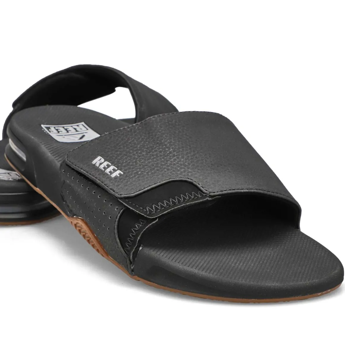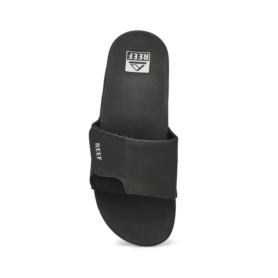 The Fanning black/silver slide sandals from Reef are a classic staple of supreme beachside style! Water-friendly synthetic upper. Contoured compression molded EVA footbed with anatomical arch support. Full 360 degree heel airbag enclosed in soft polyurethane. Church key to open your “soda” bottle. Reef icon herringbone rubber outsole design.