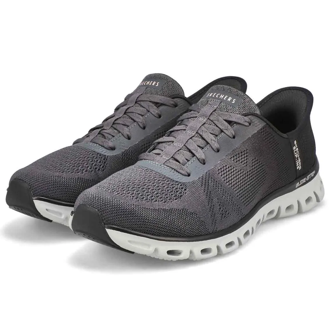 Simply step into flexible comfort wearing the Hands Free Slip-ins Glide Step Excite black/ charcoal sneaker from Skechers. Designed with Skechers exclusive Heel Pillow. this stretch-laced style features a mesh upper with synthetic hotmelt overlays, a Skechers Air-Cooled Memory Foam comfort insole and a Glide-Step geometric cushioned midsole. Crafted with 100% vegan materials.