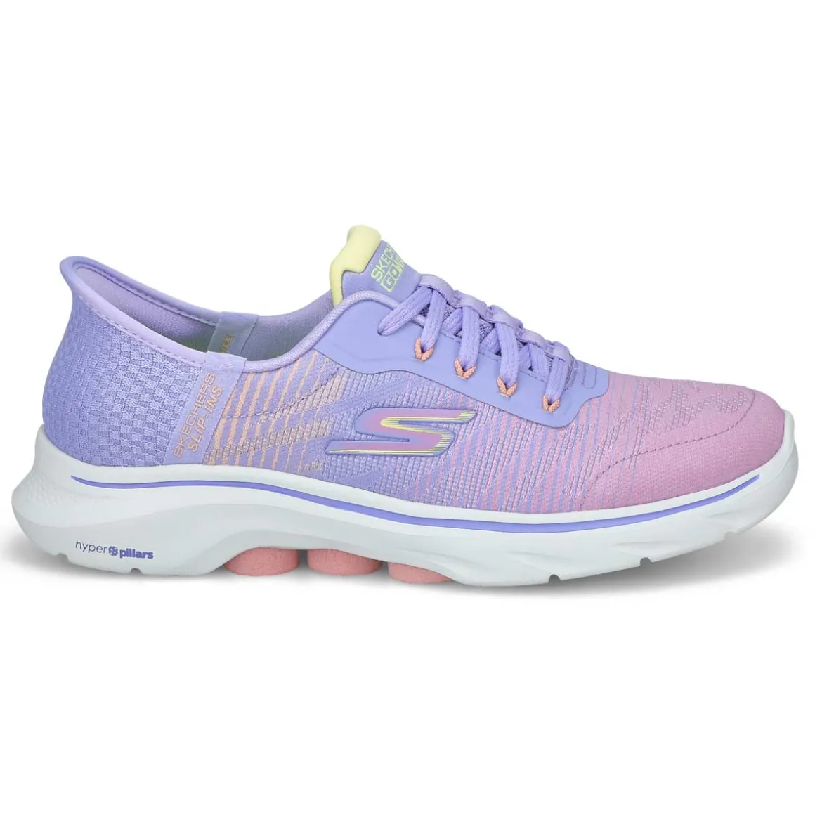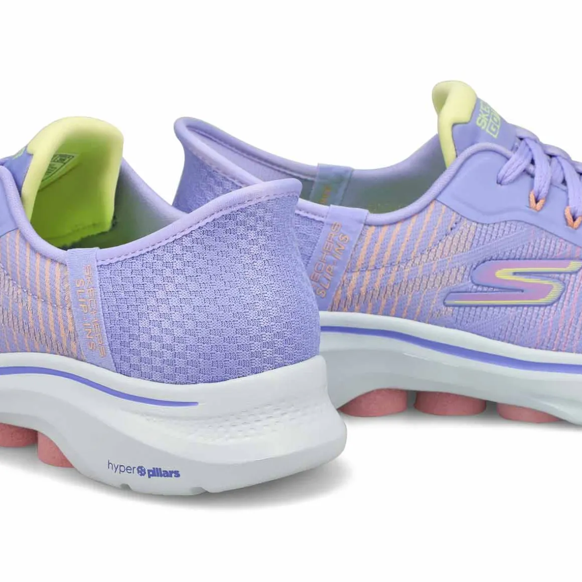 Walk in easy-wearing comfort with Skechers Hands Free Slip-ins GO WALK 7 lavender/ multi sneaker from Skechers. Designed with Skechers exclusive Heel Pillow holds your foot securely in place. This hands-free walking slip-on features an engineered mesh upper with a laced front, Skechers Air-Cooled Memory Foam insole, lightweight ULTRA GO cushioning, and high-rebound Hyper Pillars for added support.