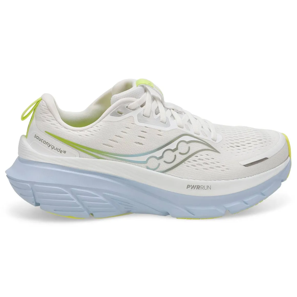 Run with Confidence. The Guide 18 white / ice melt Perfromance Sneaker from Saucony elevates comfort to new heights with enhanced PWRRUN cushioning, providing more protection than ever before. The innovative CenterPath technology ensures you stay secure and confident with every step.This daily running shoe also features a redesigned upper with breathable mesh for improved airflow and a padded heel collar for a snug fit. Go further with the Guide 18.