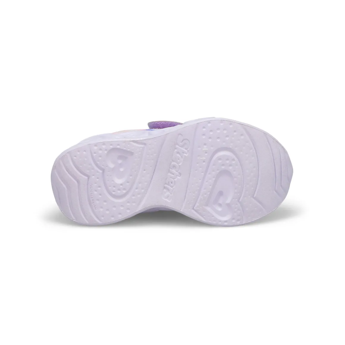 Sparkle and shine in magical delight wearing the Heart Lights Light Up lavender/ light pink sneaker from Skechers. This light-up design features a mesh upper with synthetic overlays, an adjustable instep strap closure, and a sculpted light-up midsole with ‘heart chain’ detail. Shock-absorbing cushioned midsole with a flexible traction outsole.
