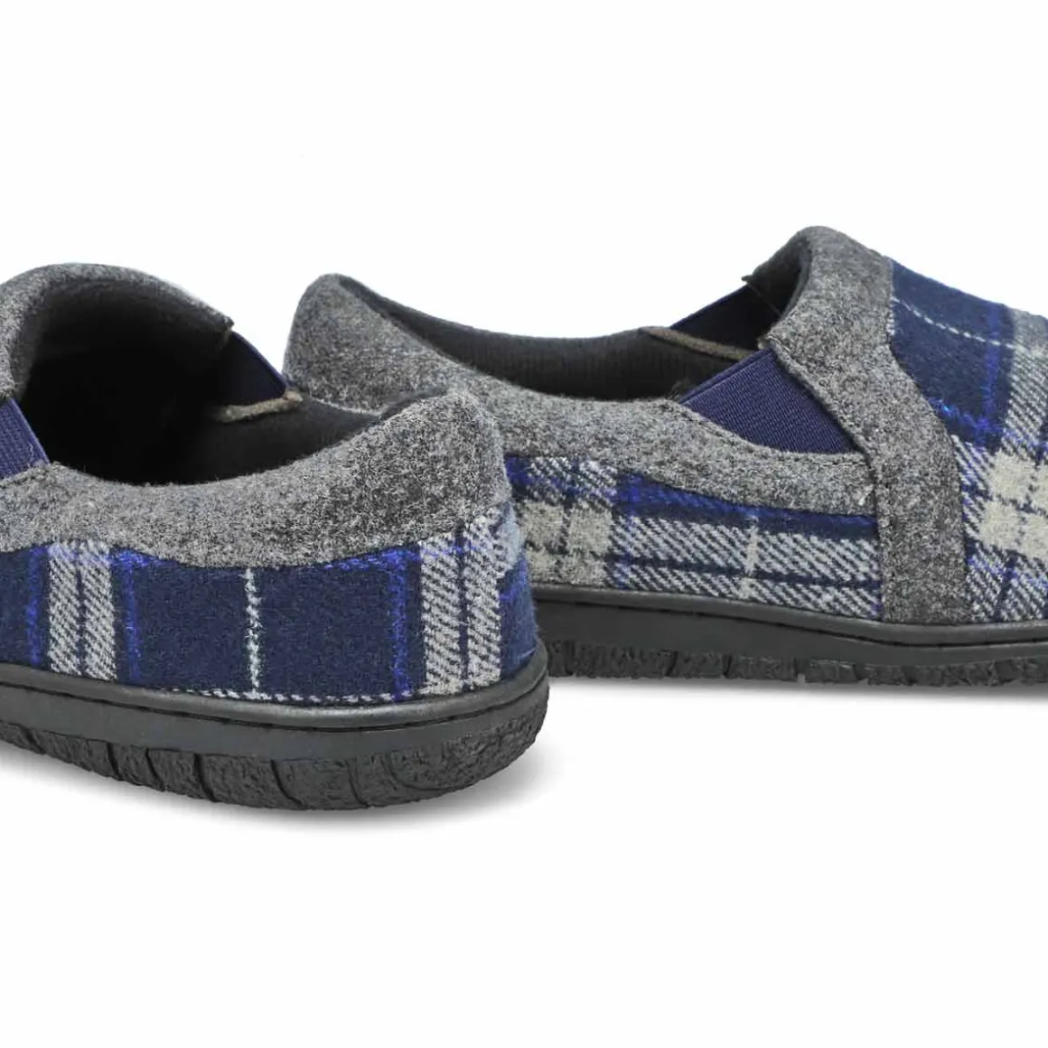 You will love the comfort and look you get in the Jacob navy plaid memory foam slippers from SoftMoc..The elastic goring on the sides will make for an easy on/off motion, and the memory foam insole will add that comfort that everyone loves. Relax after a long day with the Jacob slipper!
