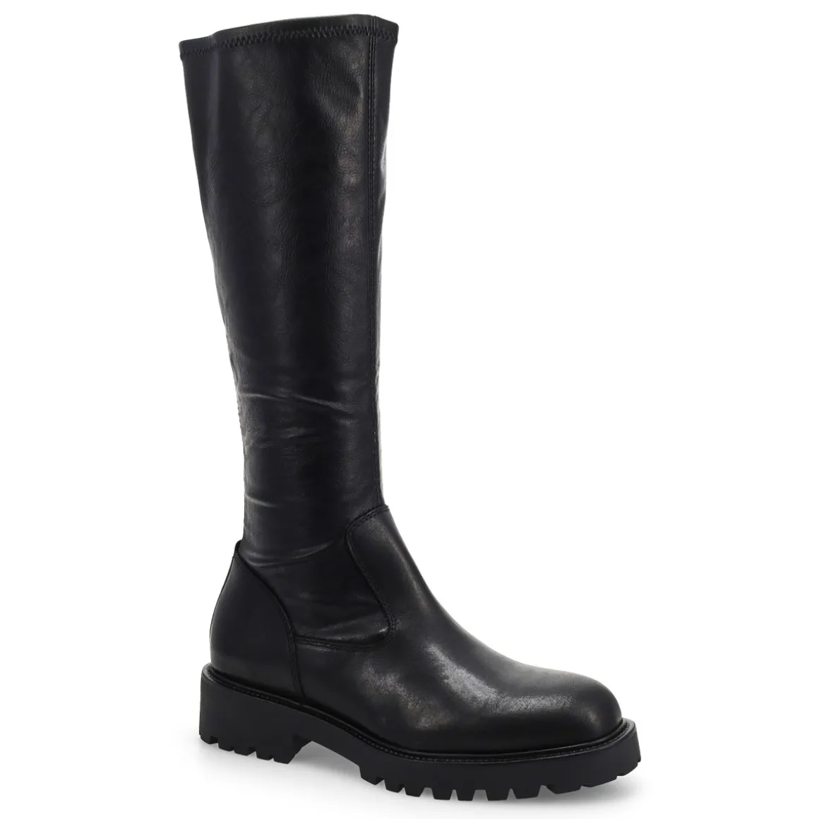 The Kenova black Tall Riding Boot from Vagabond Shoemakers, brings a refined look to this season’s chunky silhouettes. Crafted in smooth black leather, the minimalistic upper is paired with sturdy rubber outsoles measuring 40mm for a subtle lift. The knee-high design is equipped with inside zippers and heel loop tabs for easy wear and removal.