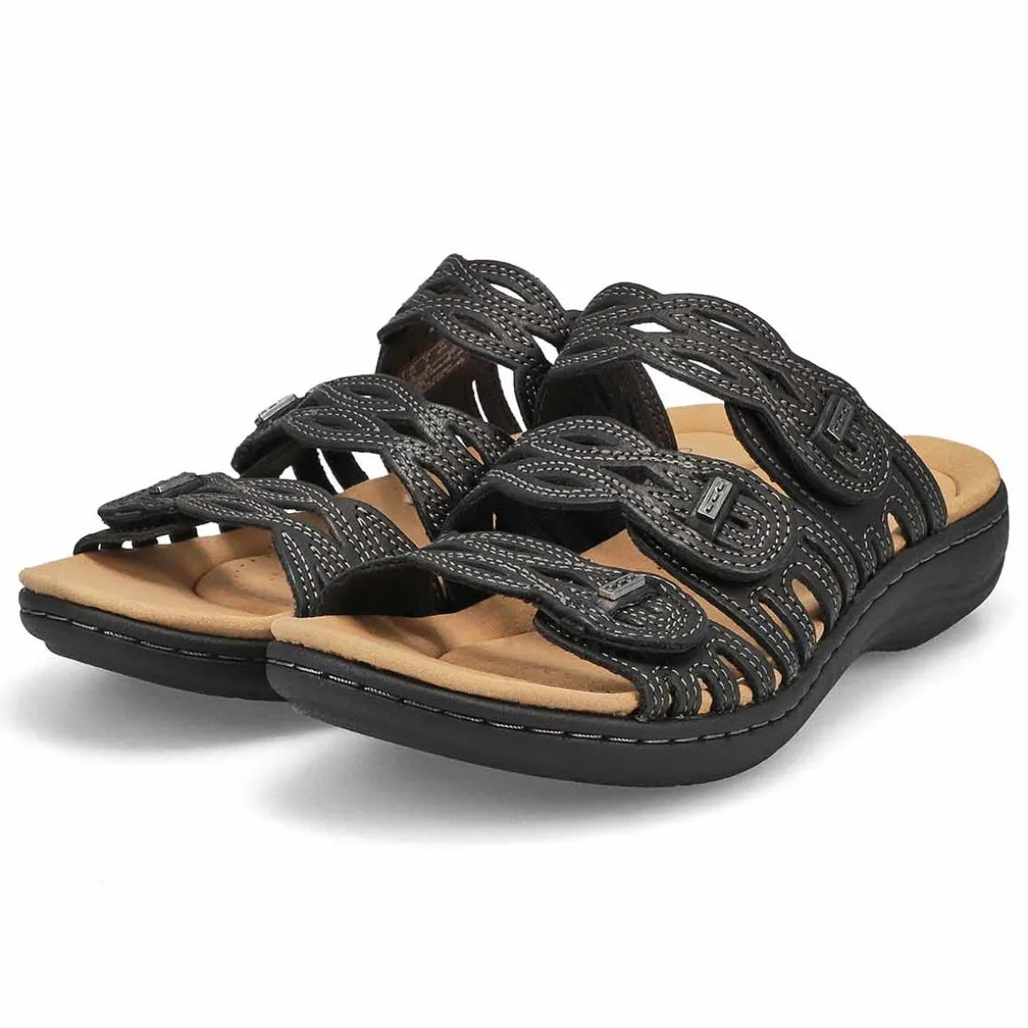 Keep your warm weather looks fresh with the casual styling of these Laurieann Ruby black sandal from Clarks. Made of durable openweave leather upper with a triple strap hook-and-loop construction, these casual sandals have a round open toe and slip-on design, Features include soft fabric lining, Ultimate comfort footbed for superior underfoot cushioning and a targeted cushioned heel pad, and a synthetic sole with molded heel.