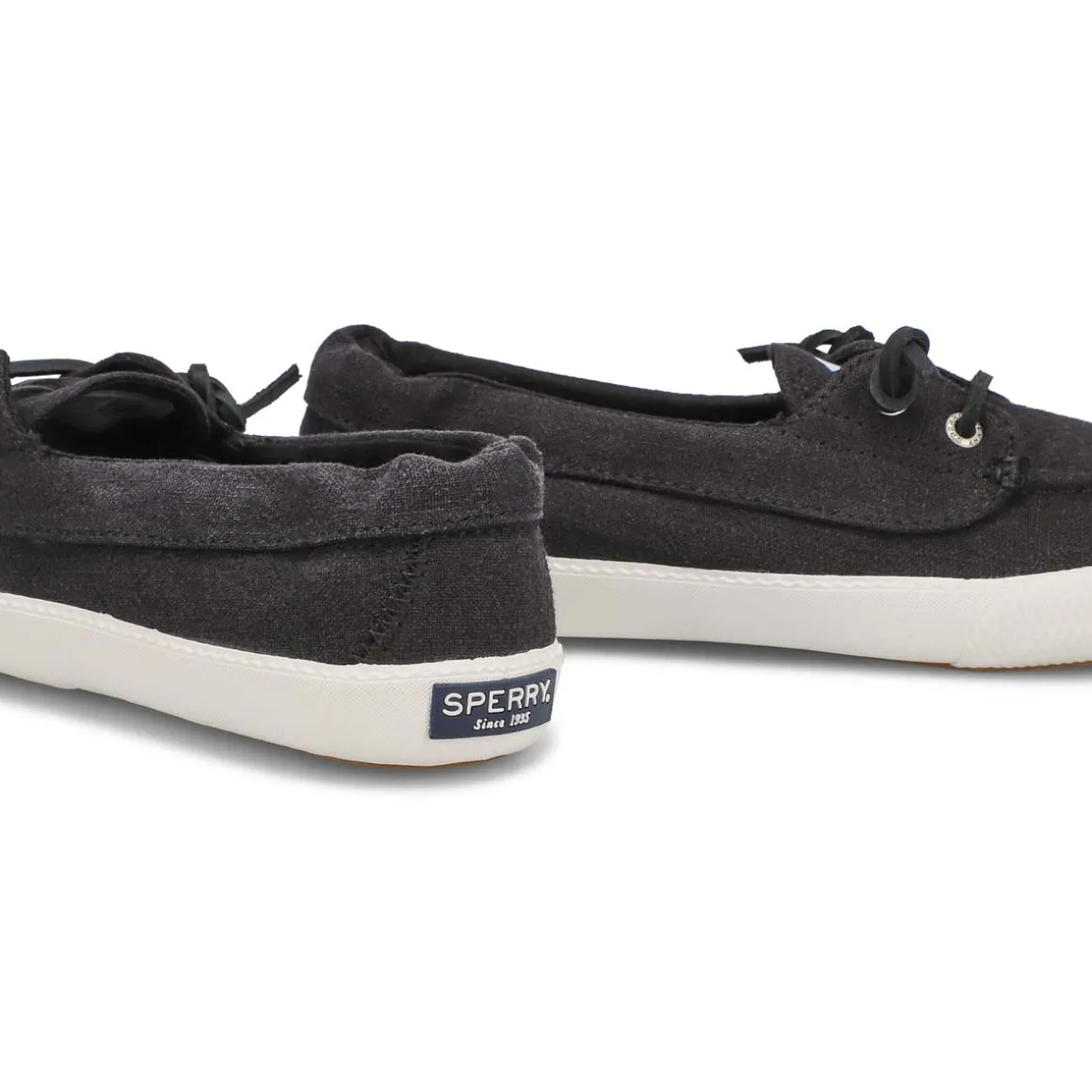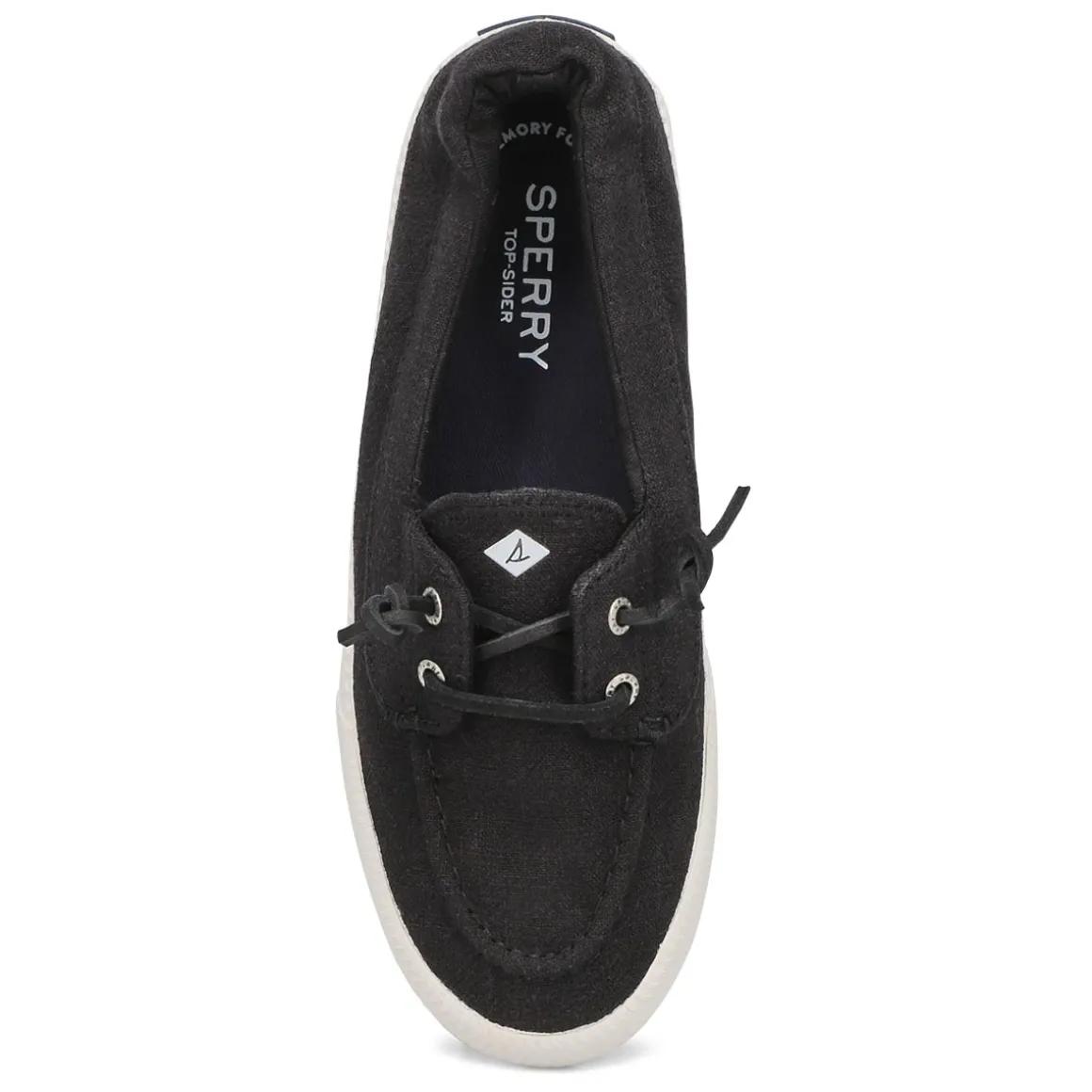 The Lounge Away 2 black boat shoe from Sperry Top-Sider is a boat shoe-inspired slip on that delivers a flexible and relaxed fit. Slip on fit with non functional knotted laces and sparkle textile upper for flair on a classic Sperry styling. Memory Foam cushioned footbed provides comfort and non-marking rubber outsoles deliver added traction.