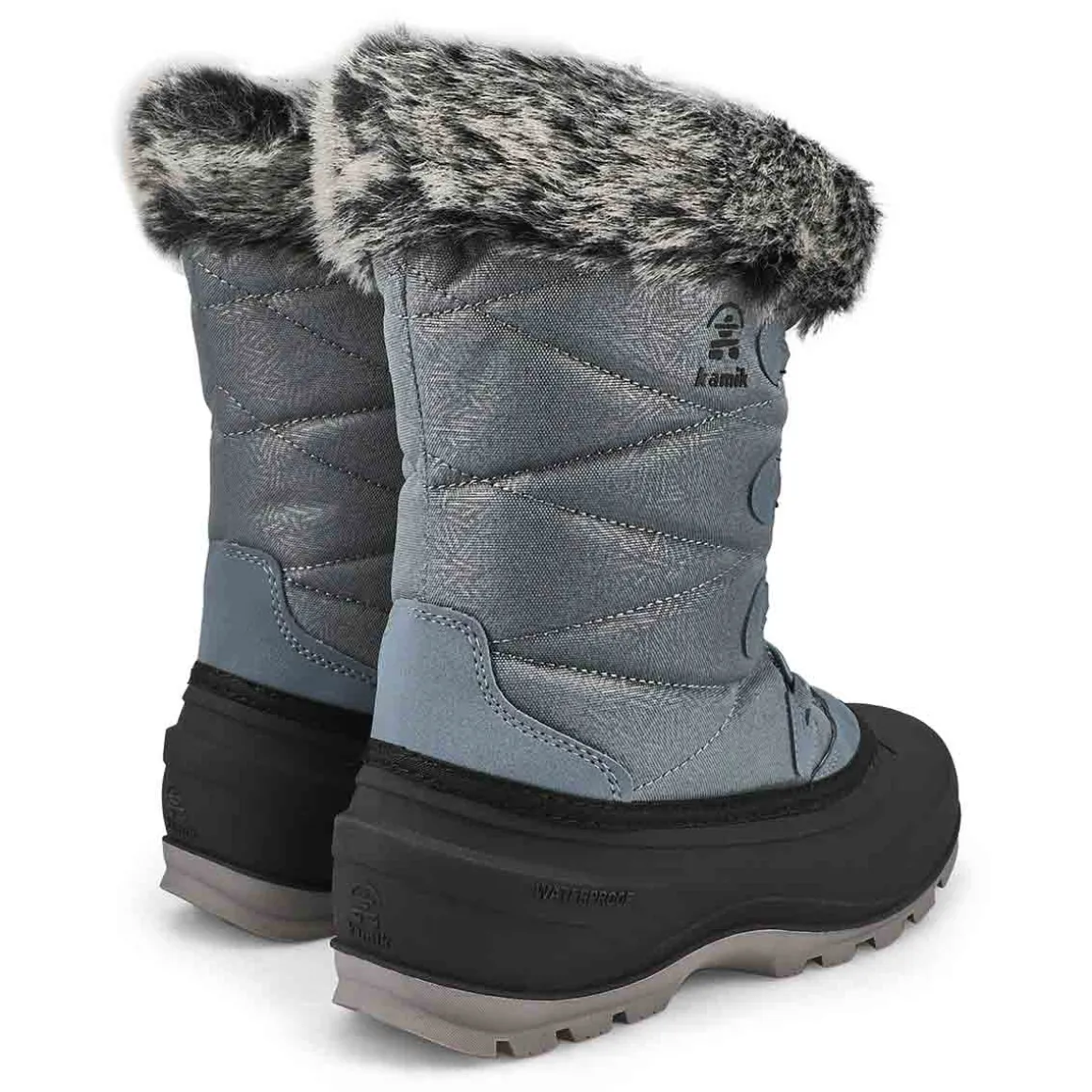 Stay dry on wet days in the Momentum 3 charcoal waterproof winter boots from Kamik. Featuring a waterproof upper and seam-sealed waterproof construction. Designed with 200B 3M Thinsulate insulation and moisture wicking faux shearling lining. Removable Kamik comfort EVA insole with antibacterial treatment. Waterproof and flexible synthetic rubber shell. ICEKISS dual-density synthetic rubber outsole.