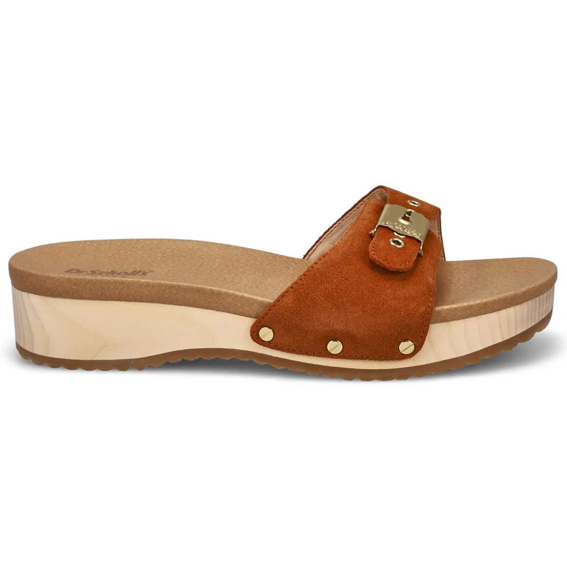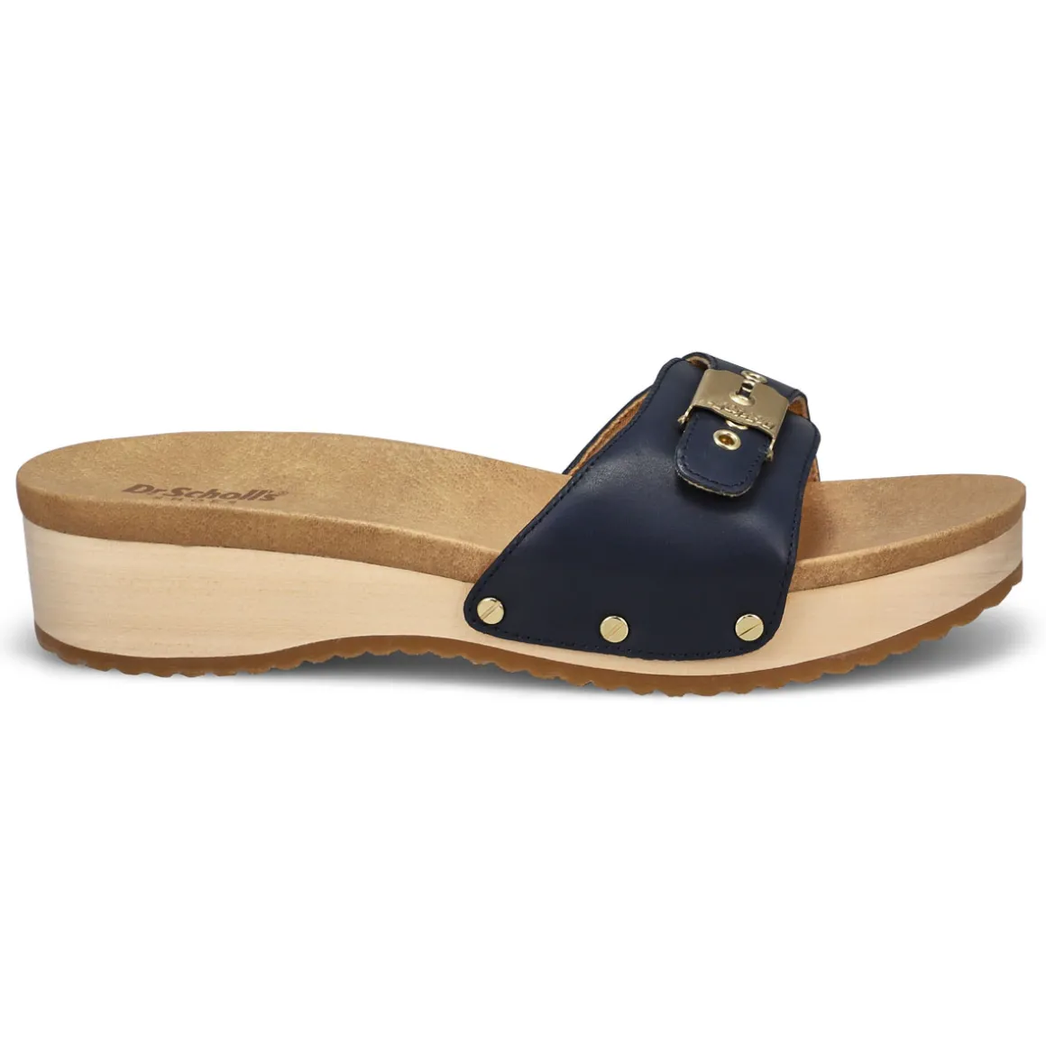 - Slip on clog sandals with iconic metallic buckle and 1 1/3 inch wood midsole with rubber sole
