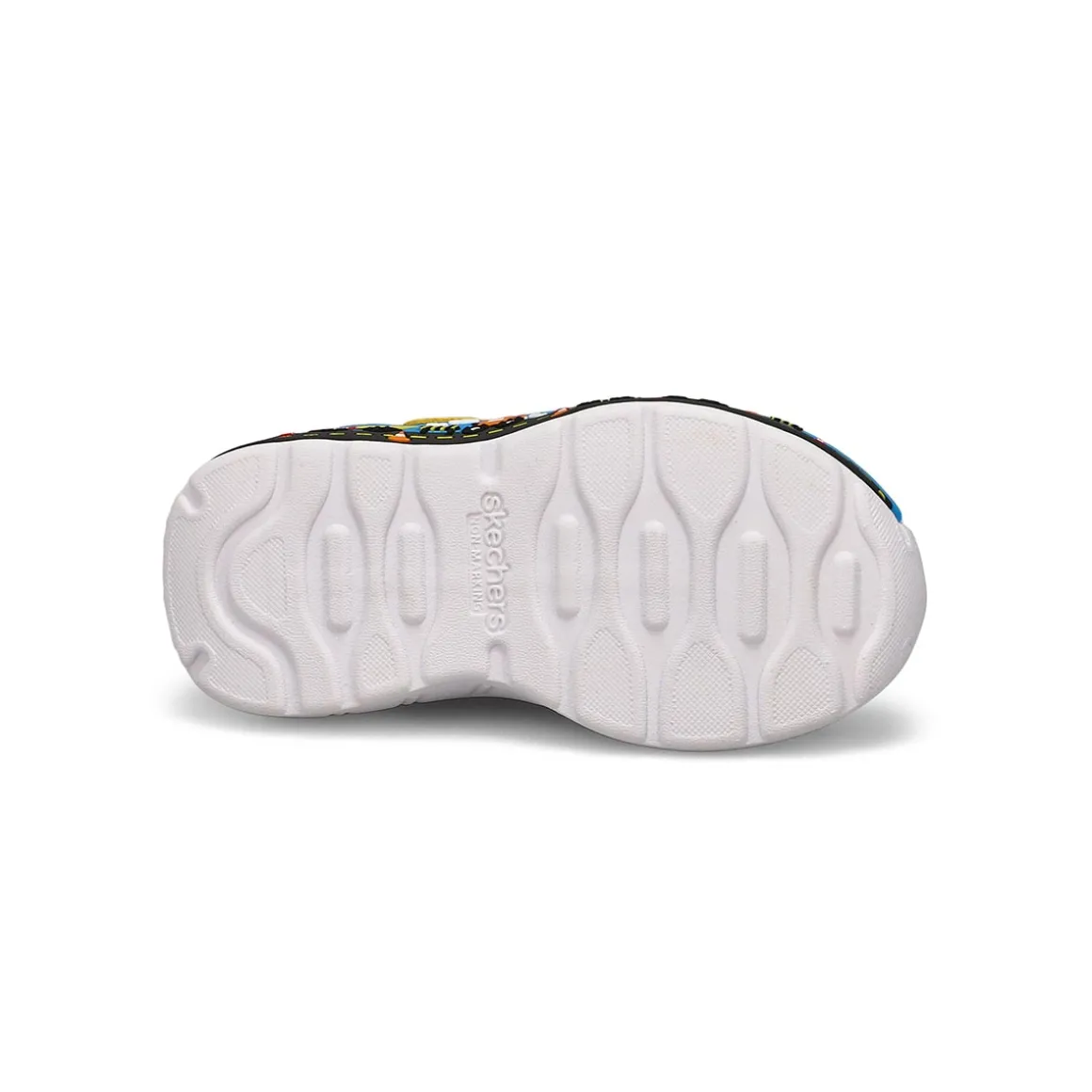 Pair your feet with a field of fun in the Play Scene black/ yellow sneaker from Skechers. This fun themed design features a printed mesh and synthetic overlay upper. Designed with fixed stretch laces, an adjustable instep strap, Skechers easy-on, easy-off adaptive closure makes for a customized fit.