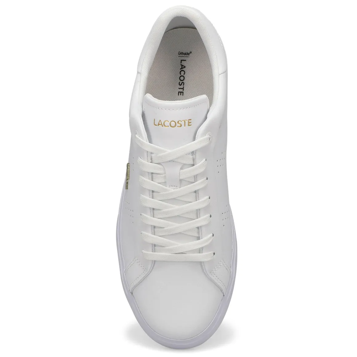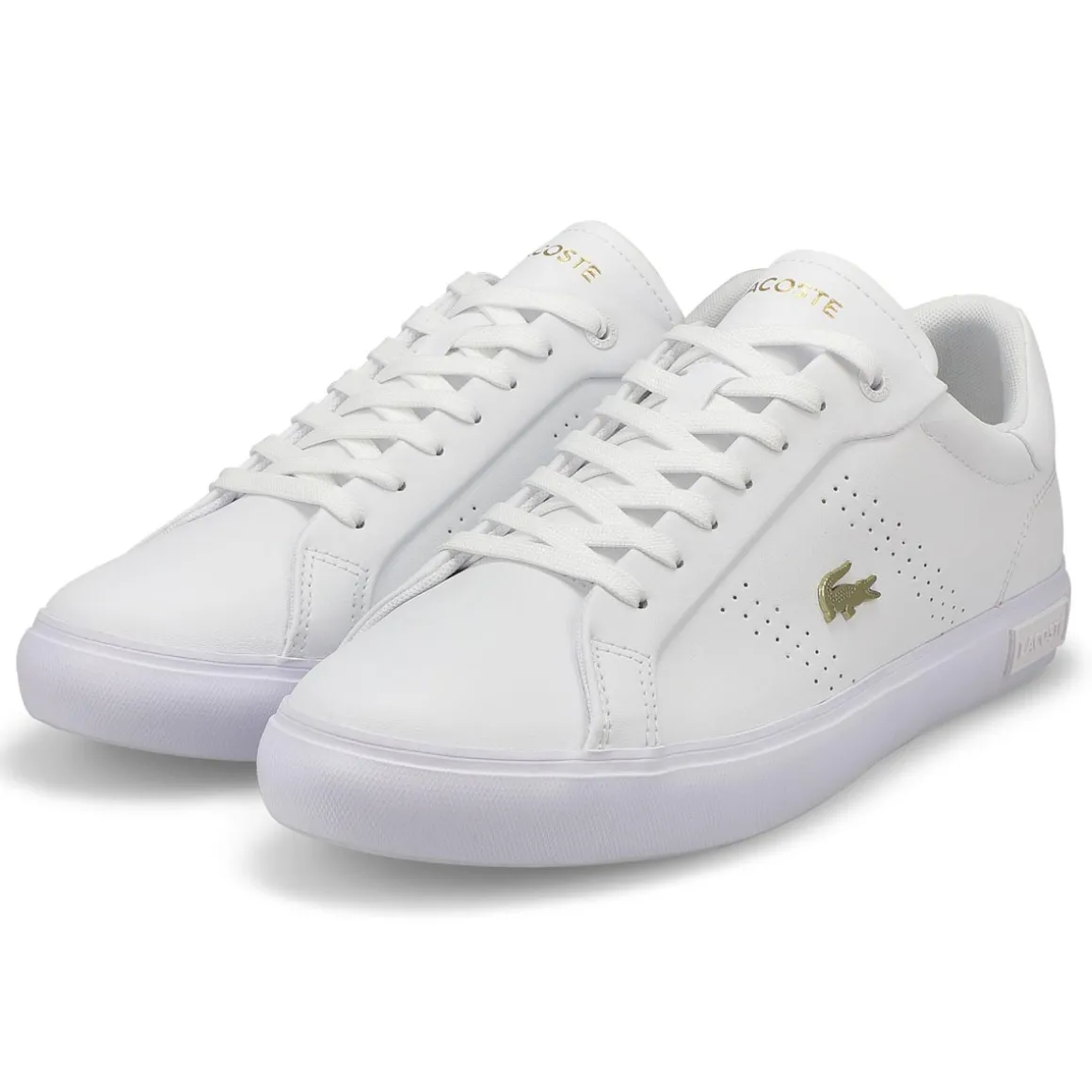 The women’s Powercourt 2.0 in white / gold by Lacoste is a timeless vulcanised sneaker with sleek leather uppers, colour pops and iconic branding. Step into the present, with these court-inspired silhouette sneakers with perforation detailing, leather and synthetic uppers, textile lining. The rubber outsole on these shoes will ensure all day comfort.