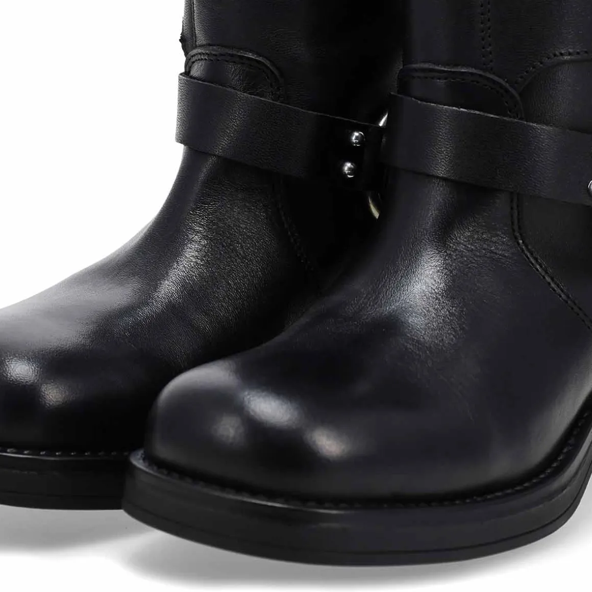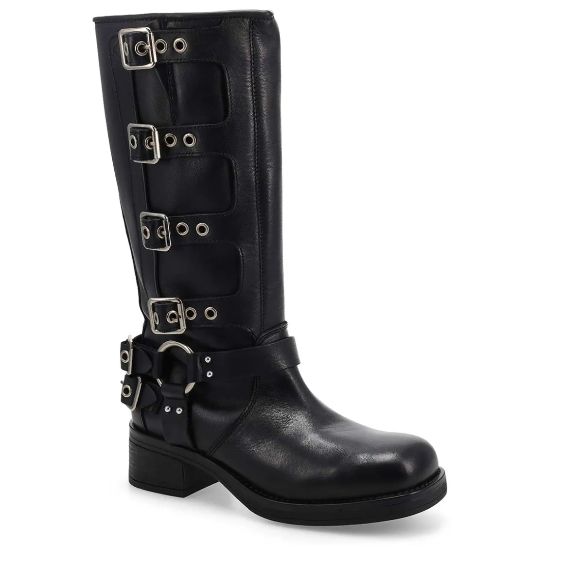 The Rockyy black Knee High Boot from Steve Madden features the wide profile of an engineer boot with harness and buckle hardware adding an industrial edge and giving the design an adjustable fit. Top gore with 4 adjustable buckle straps. Block heel engineer boot design. Leather upper with breathable textile lining.