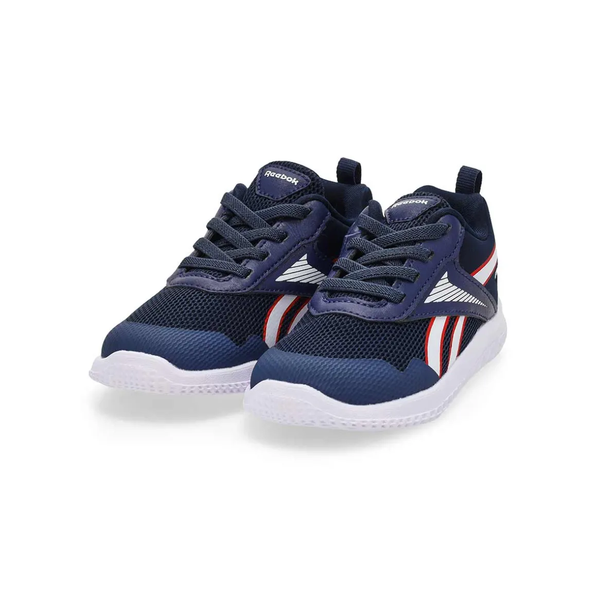 They plays hard. The Rush Runner Vector Navy/ White/ Vector Red sneakers from Reebok are built for support on the playground and beyond. The textile upper is lightweight and comfortable, and the iconic Vector logo adds athletic style. The EVA midsole provides underfoot cushioning for running, jumping and climbing. Durable rubber outsole.