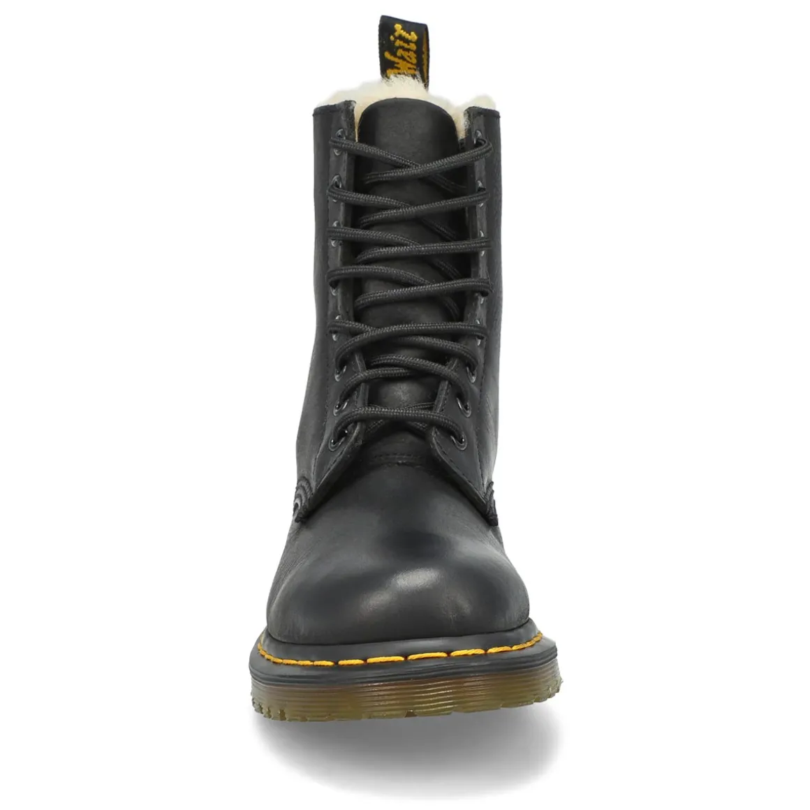 Made to keep your feet comfortable, the Serena 8 eye nickel grey faux fur lined boots from Dr. Martens are designed with a Goodyear welt construction where the upper and sole are heat-sealed and sewn together with the classic Z-welt stitching for long-lasting durability and flexibility. Lightly cushioned leather and textile insole for all-day comfort. Dr. Martens’ original air-cushioned outsole is slip, oil, and abrasion resistant. It also features a classic grooved sole pattern.