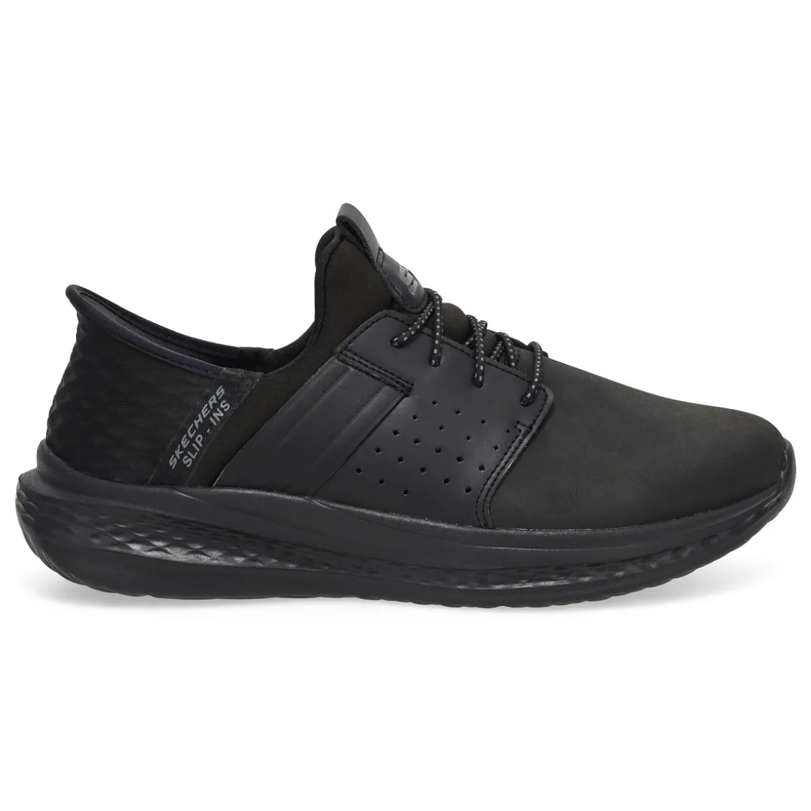 Sleek athletic style arrives with signature comfort in the Slip-ins Relaxed Fit: Slade Zachary black casual from Skechers. Designed with Skechers’ Exclusive Heel Pillow, this stretch-laced style features a leather and synthetic upper with a charcoal-infused Skechers Air-Cooled Memory Foam insole and Skechers Goga Mat Arch cushioning. Charcoal infused insole helps neutralize potential odor. Wide Width