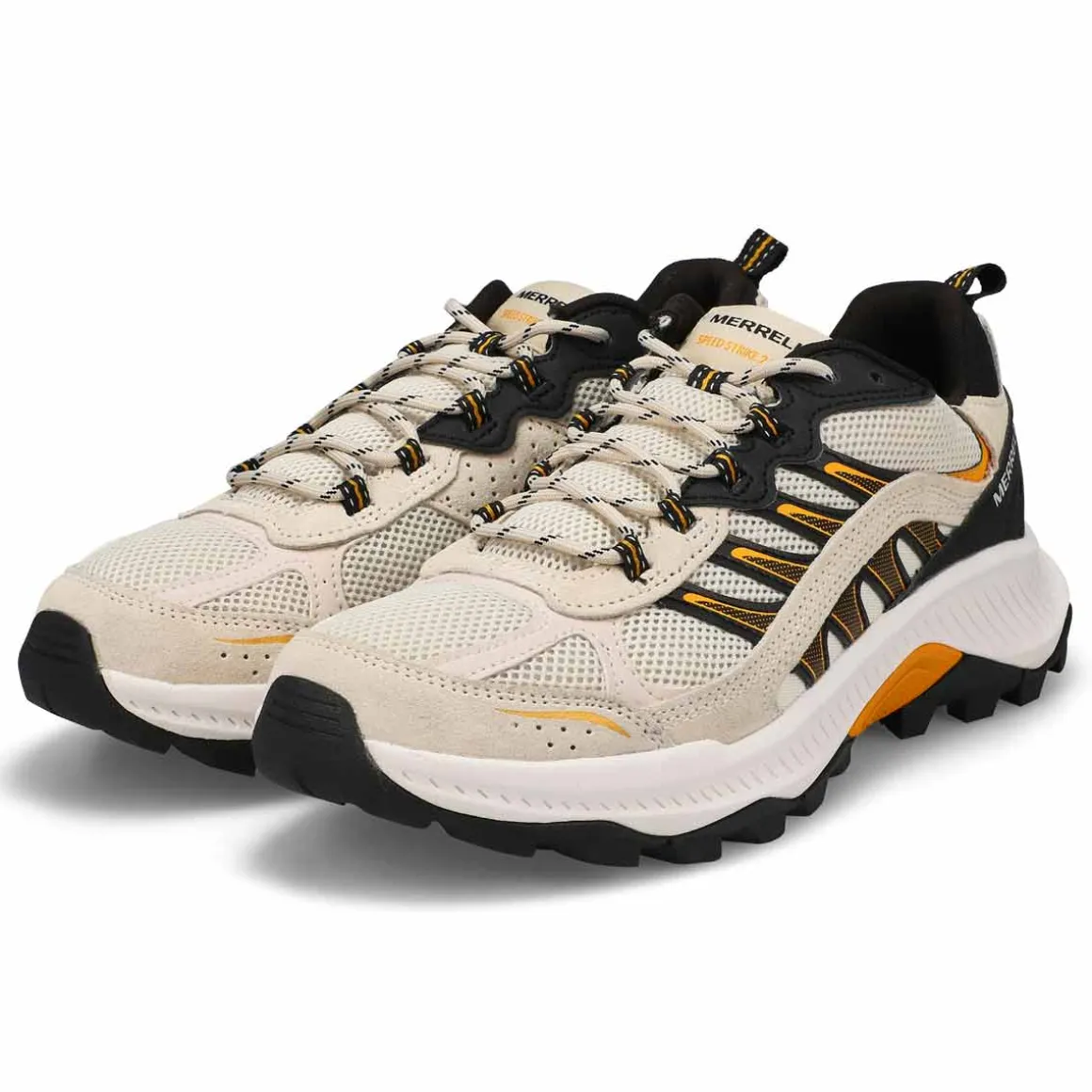 The Speed Strike 2 Trek chalk/ rush lace up Hiking Shoe from Merrell pushes the Speed Strike franchise into a new realm. The styling and color make a statement for everyday wear. Featuring a breathable mesh upper with recycled laces. Lightweight EVA foam midsole for stability and comfort. Merrell sticky rubber outsole with durable traction that grips when and where you need it.
