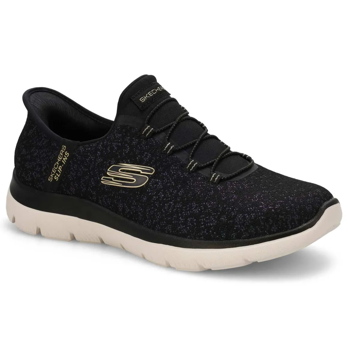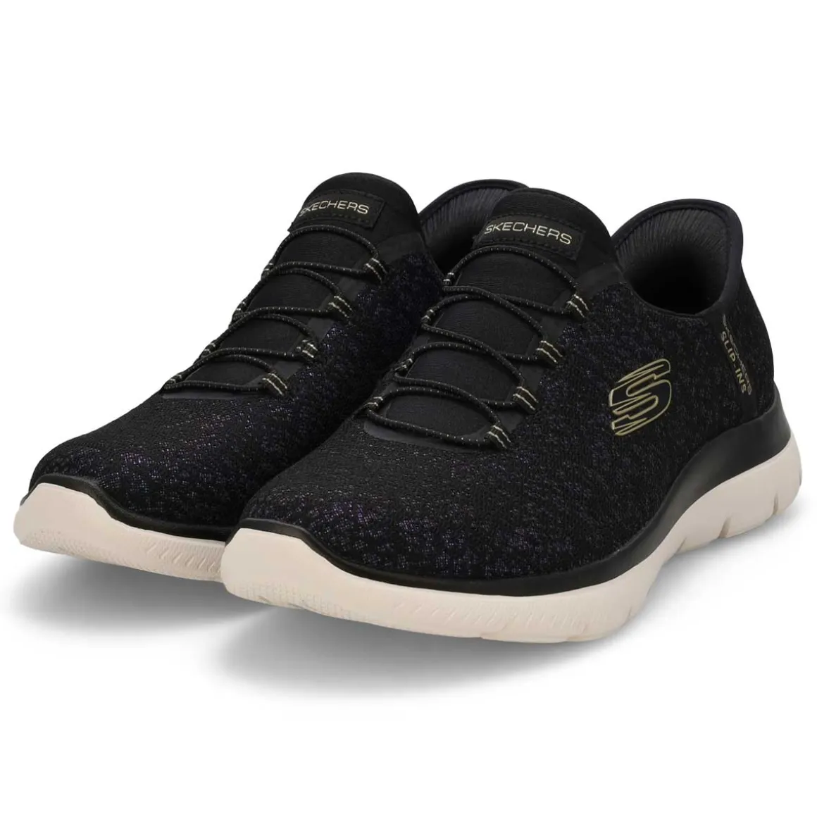 Add some shimmer to every step wearing the Slip-ins: Summits Lunar Glow black/ gold sneaker from Skechers. Designed with Skechers’ exclusive Heel Pillow helps hold your foot securely in place. This vegan slip-on features an iridescent mesh upper with fixed stretch laces and a cushioned Skechers Air-Cooled Memory Foam comfort insole.