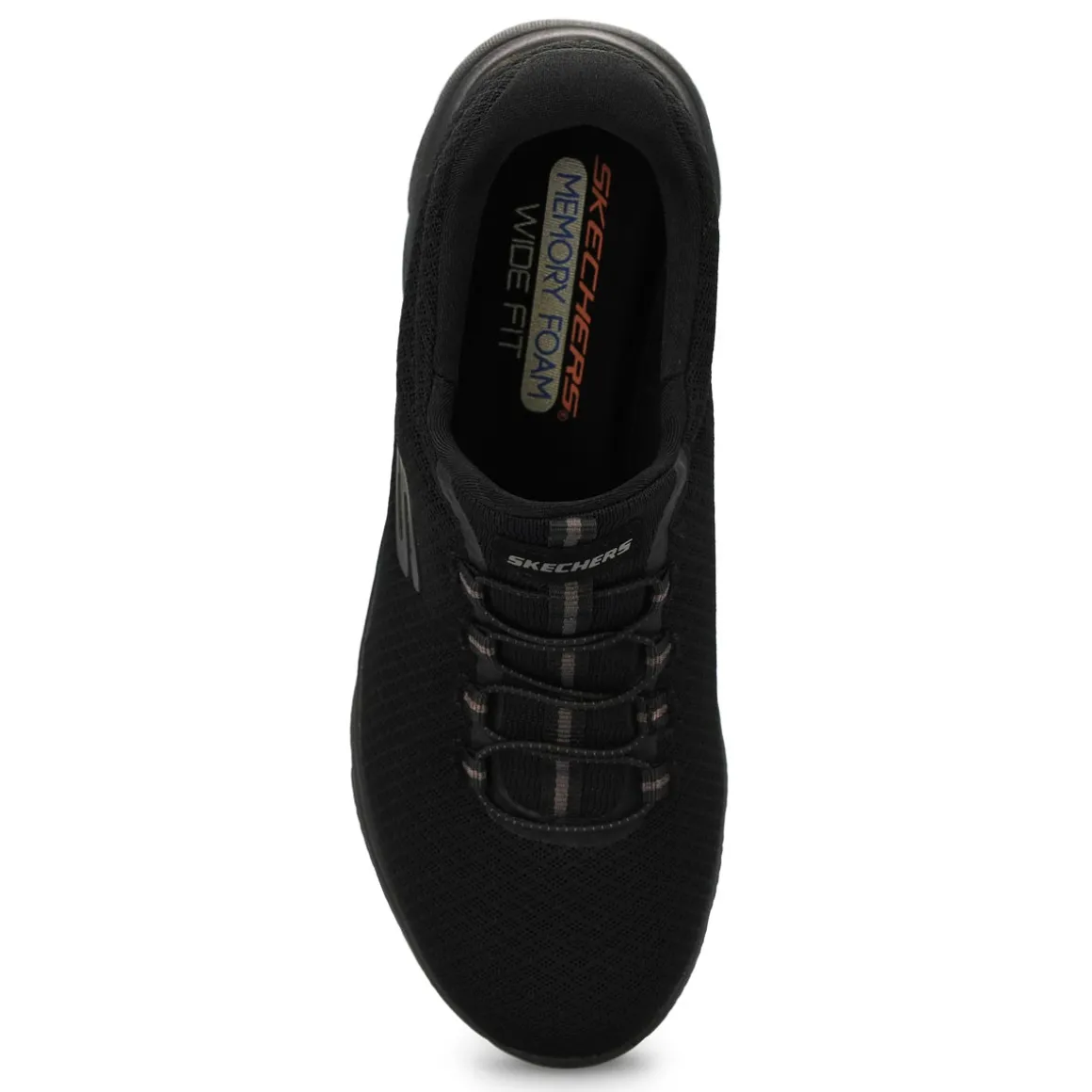 Get right to the sporty style and comfort wearing the Summits black slip on from Skechers. Features a Jersey knit mesh nearly one piece upper in a nearly seamless upper design. Slip on bungee front athletic training sneaker design. Soft fabric shoe lining with a Memory Foam full length cushioned comfort insole for all day comfort. Wide Width.