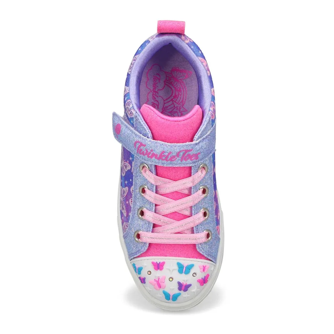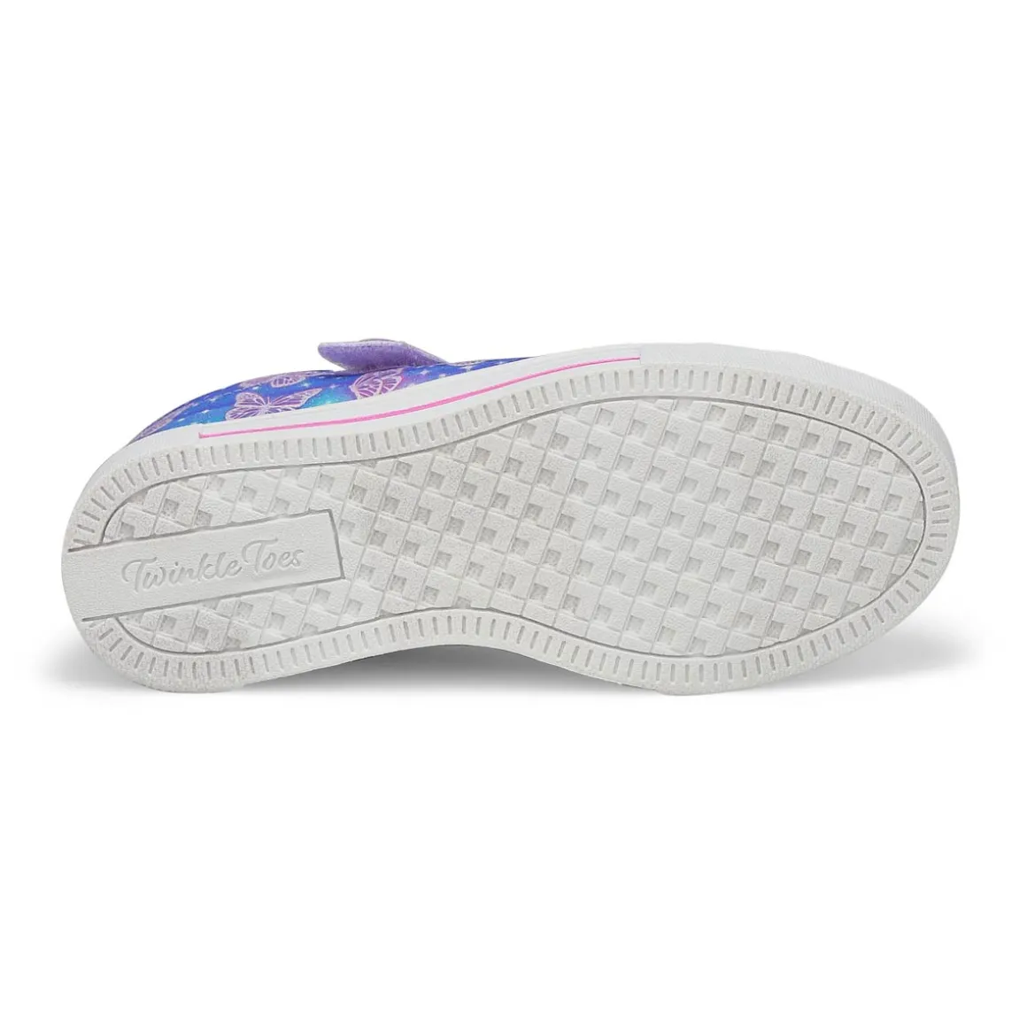 Take to the skies in magical style wearing Skechers Twinkle Toes Twinkle Sparks Ombre Flutter. This glittery lighted design features a rainbow print synthetic upper with butterflies. Stretch laces and an adjustable instep strap for a secure fit. Twinkle Toes light-up butterfly embellished toe cap. Shock-absorbing vulcanized midsole. Flexible traction outsole.