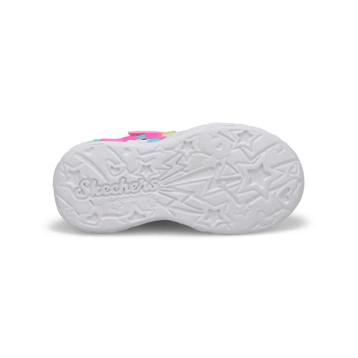 Brighten up their steps with a little unicorn magic in the Unicorn Charmer Lil Stellarpink /multi light up sneaker from Skechers. This light-up design features an ombre sheen mesh upper with star foil print, a light-up sculpted unicorn midsole and a cushioned comfort insole. Satin stretch-lace front and adjustable instep strap.