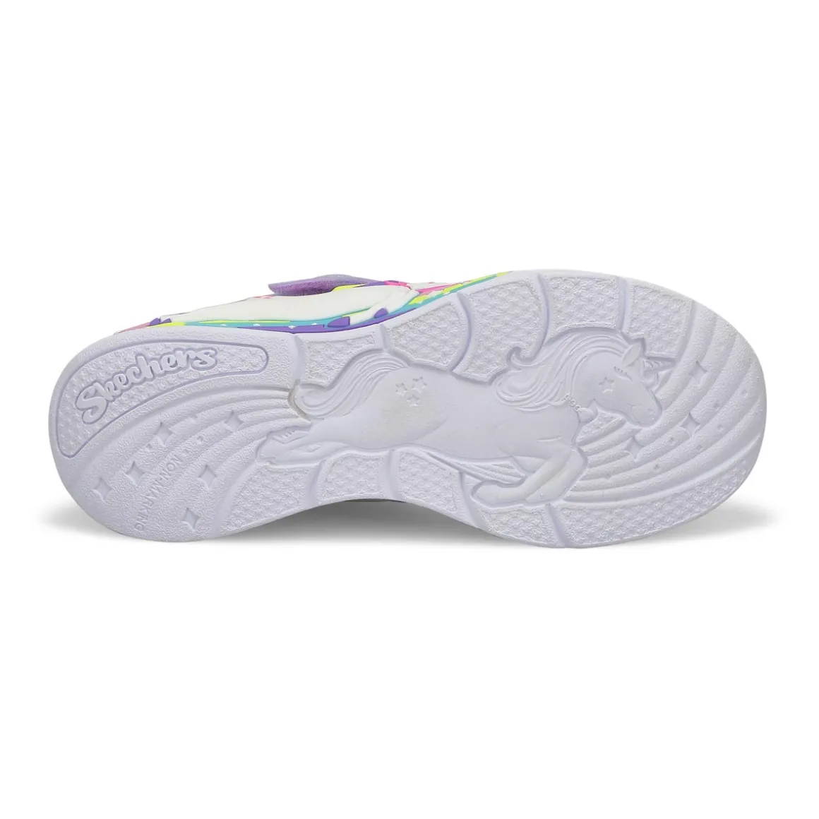 Sparkle and shine in style wearing the S-Lights Unicorn Chaser lavender/ multi sneaker from Skechers. This sporty Magical Collection lighted design features a synthetic glitter finish upper with unicorn and rainbow side graphic, stretch laces, adjustable instep strap, and a cushioned comfort footbed. Skechers easy on, easy off Adaptive Closure for a customized fit.