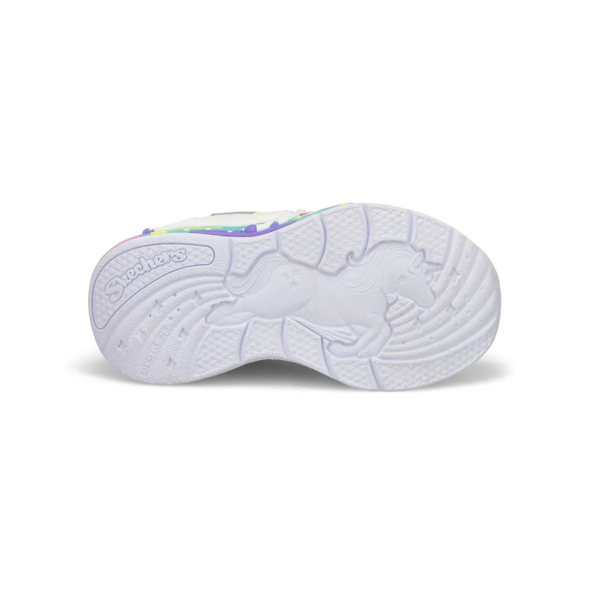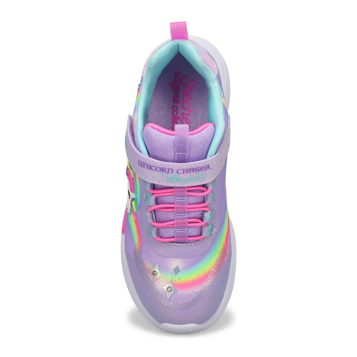Sparkle and shine in style wearing thes S-Lights Unicorn Chaser lavender/ multi sneaker from Skechers. This sporty Magical Collection lighted design features a synthetic glitter finish upper with unicorn and rainbow side graphic. stretch laces with an adjustable instep strap for a secure fit, and a cushioned comfort footbed. On/off light button.