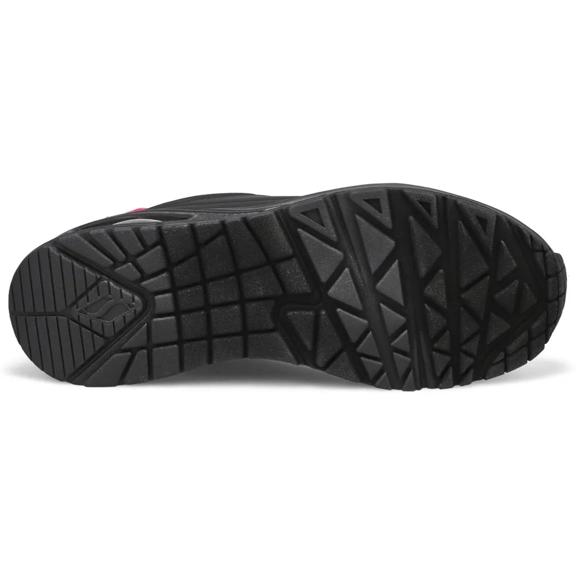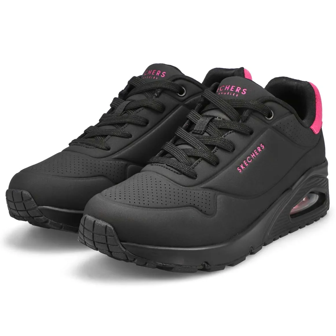 Make a stylish statement in comfort wearing the Uno- Pop Back black/ hot pink lace up sneaker from Skechers. This lace-up fashion jogger features a durabuck upper with contrast suede trim, a Skech-Air visible airbag midsole, the Uno Pop Back sneaker from Skechers is designed with an Air-Cooled Memory Foam insole for all day comfort.