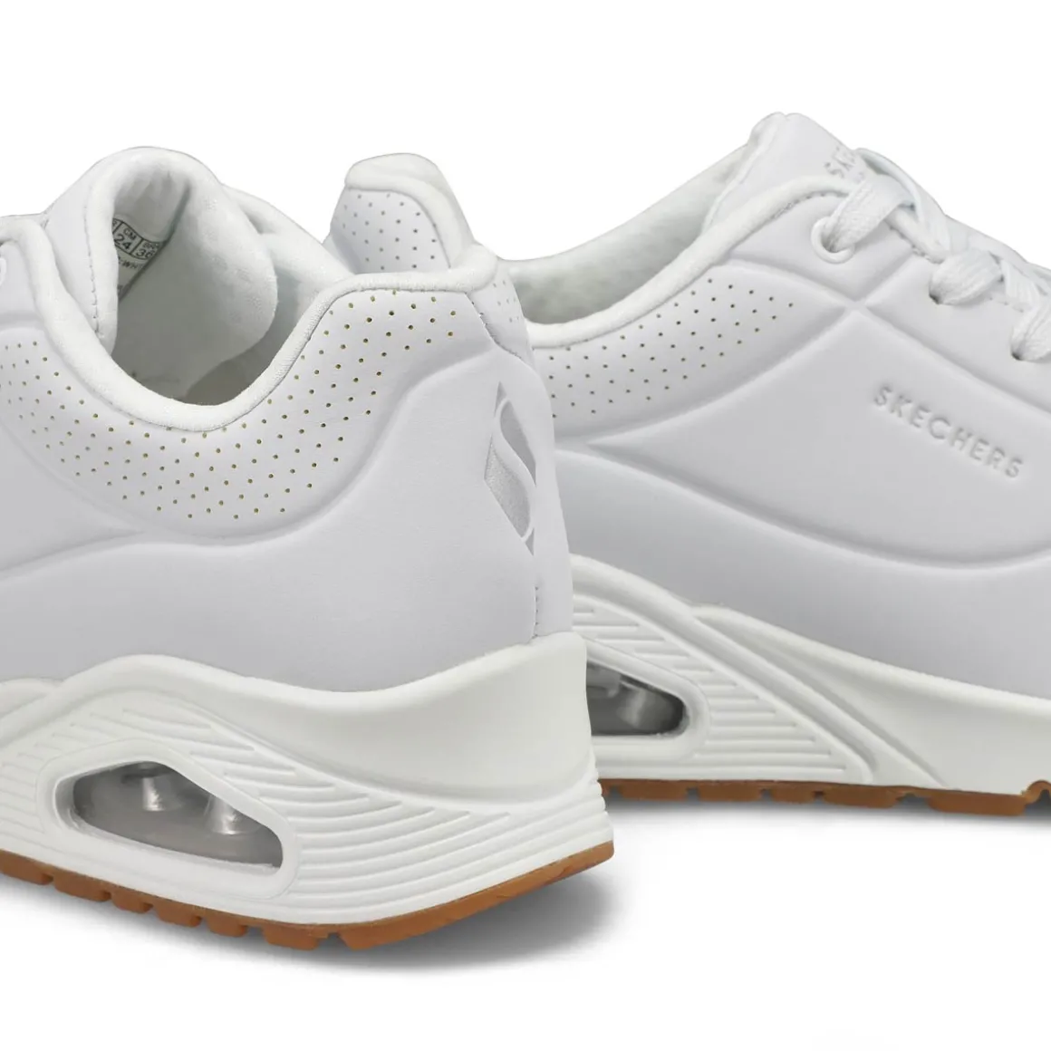 Classic air cushioned style meets updated comfort in the Uno Stand On Air wine fashion sneaker from Skechers. Smooth leather-textured synthetic upper in a lace up classic fashion sneaker with stitching and perforation accents. Air Cooled Memory Foam insole, visible air cushioned midsole. Padded collar and tongue for added comfort. Classic style midsole with embossed texture detail.