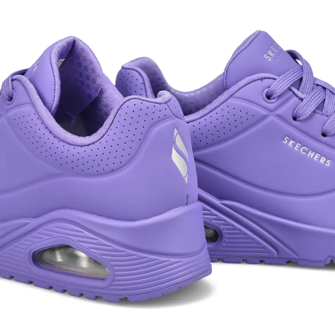 Classic air cushioned style meets updated comfort in the Uno Stand On AIr black fashion sneaker from Skechers. Smooth leather-textured synthetic upper in a lace up classic fashion sneaker with stitching and perforation accents. Air Cooled Memory Foam insole, visible air cushioned midsole. Padded collar and tongue for added comfort. Classic style midsole with embossed texture detail.