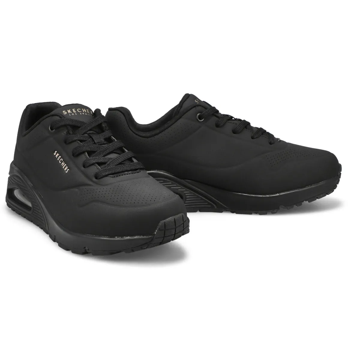 Classic air cushioned style meets updated comfort in the Uno Stand On Air red fashion sneaker from Skechers. Smooth leather-textured synthetic upper in a lace up classic fashion sneaker with stitching and perforation accents. Air Cooled Memory Foam insole, visible air cushioned midsole. Padded collar and tongue for added comfort. Classic style midsole with embossed texture detail.