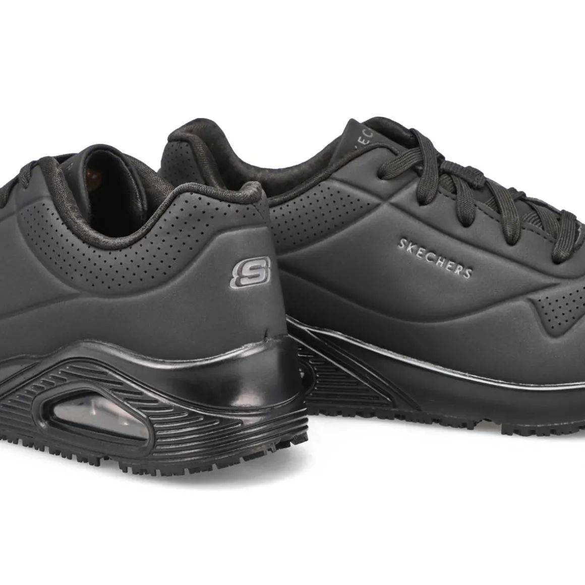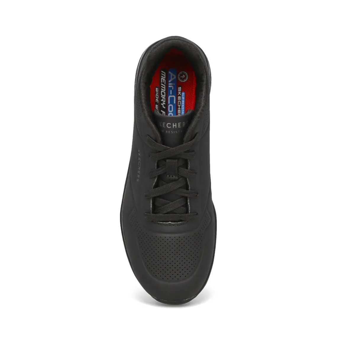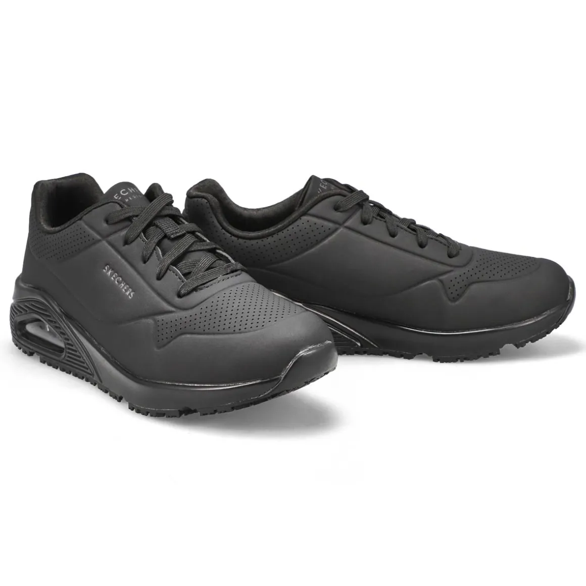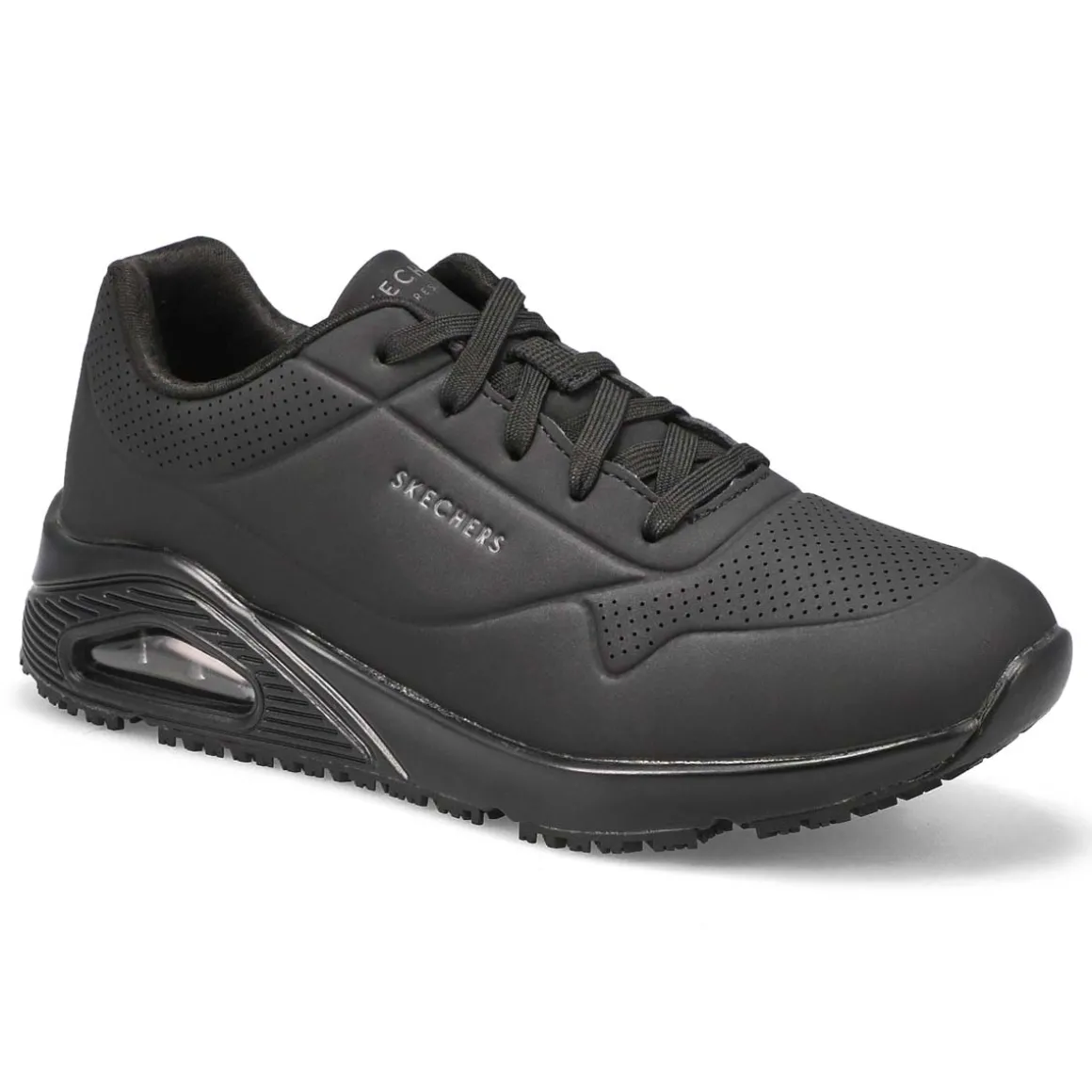 A favorite style arrives in comfort and safety with the Uno Slip Resistant Wide Sneaker from Skechers. This slip-resistant work design features a durable perforated synthetic durabuck upper with a Skechers Air-Cooled Memory Foam insole and Skech-Air visible air-cushioned midsole. Slip-resistant rubber traction outsole. EH Safe design tested ASTM F2892-11. Wide Width.