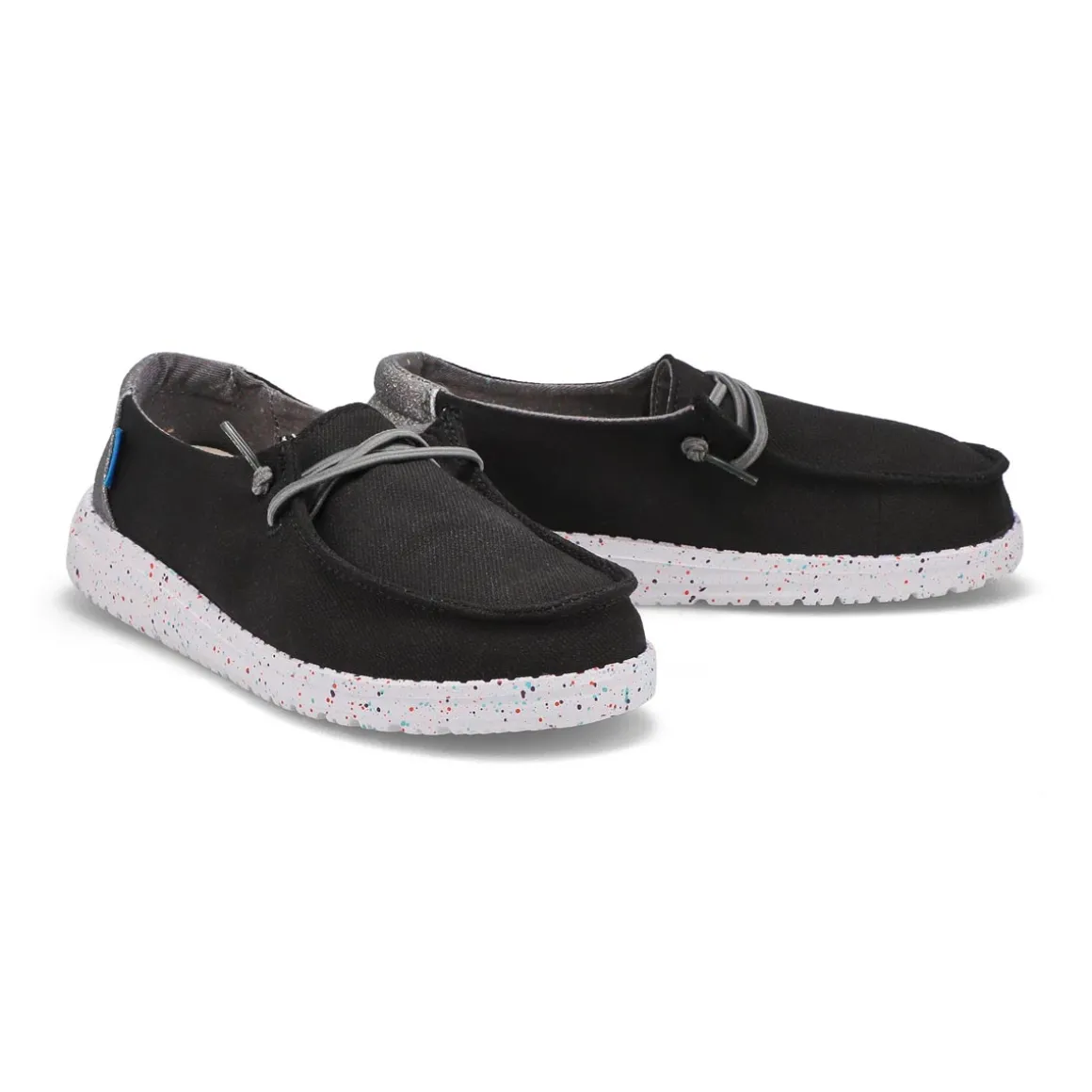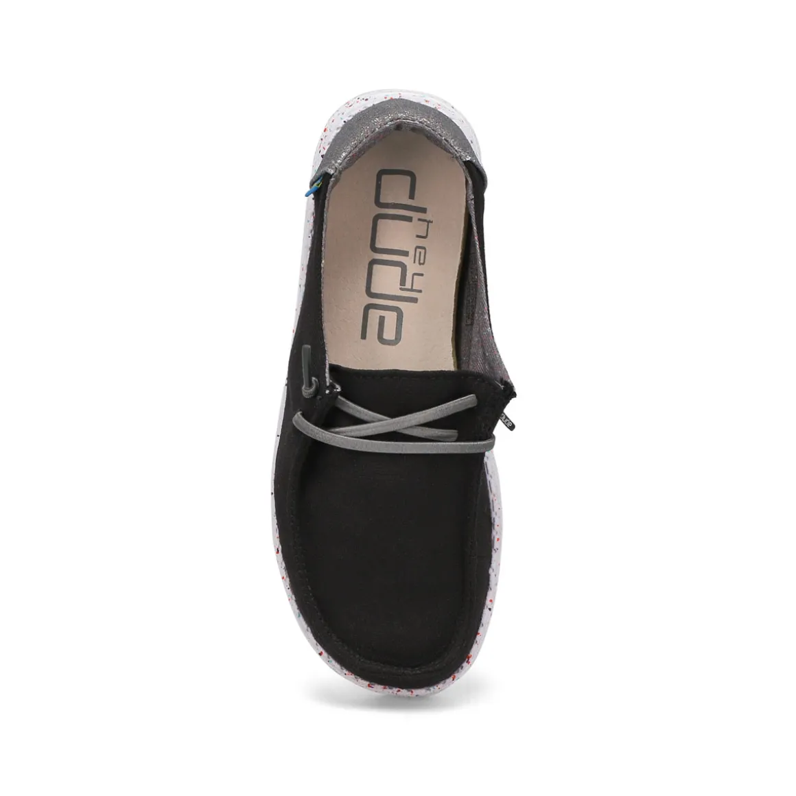 HEYDUDE’s iconic low-top moc with a custom look. Plus a little extra height and a little extra cushion. The Wendy Youth Casual disco black shoe from HEYDUDE is still super lightweight. Easy-On system and their patented UltraLIGHT EVA outsole for superior comfort. Featuring contrasting textures and hand-stitching at the heel.
